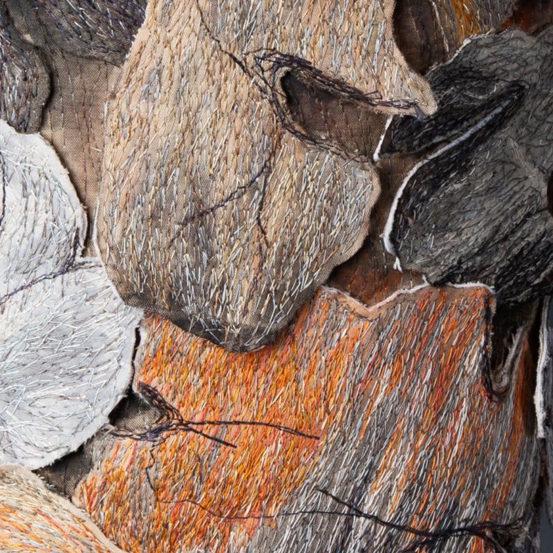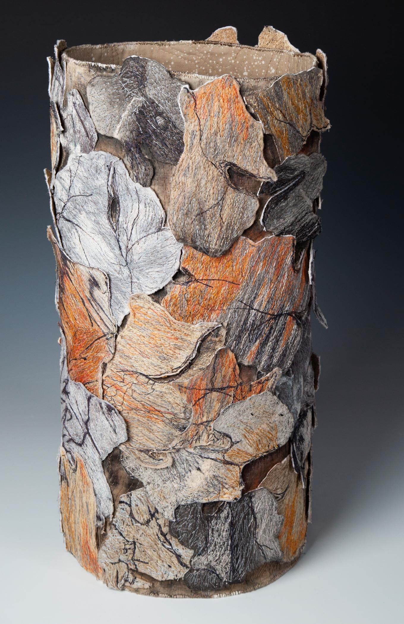 Trees have turned into a source of never-ending fascination and inspiration. Besides their wonderful textures and diverse colors, I am drawn to their amazing lines and shapes. This series of vessels endeavors to explore the textures, colors, and lines in the bark of trees from around the world. Bark is considered an accumulation of several different outer layers of a wood plant. Similarly, multiple layers are what I use to create my vessels; either by machine or hand stitching, or a combination of both. I am forced to slow down, to take my time and truly study what nature has so masterfully created as I attempt to emulate its beauty while interpreting these forms in stitch.