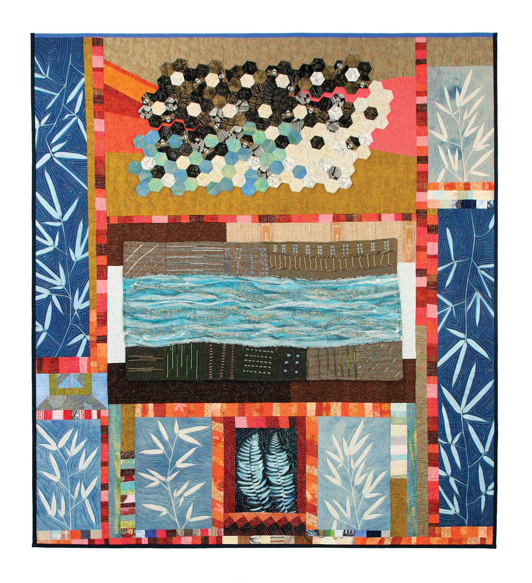 This quilt is part of a series reflecting my decades-long obsession with the Susquehanna River. It frequently appears in my dreams as my personal uber-river, wherein I hike its shores, learn to swim, and let it carry me away. Here, while still admiring the beauty, I sense a disturbance in the flow.