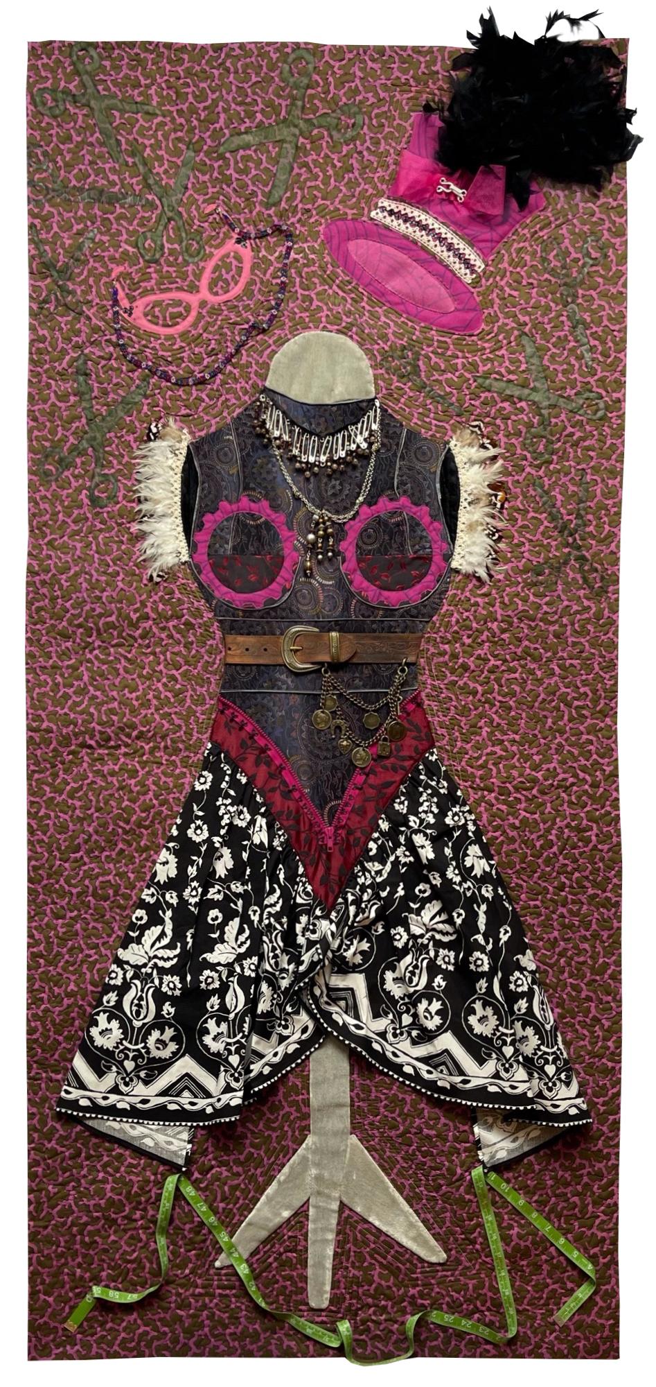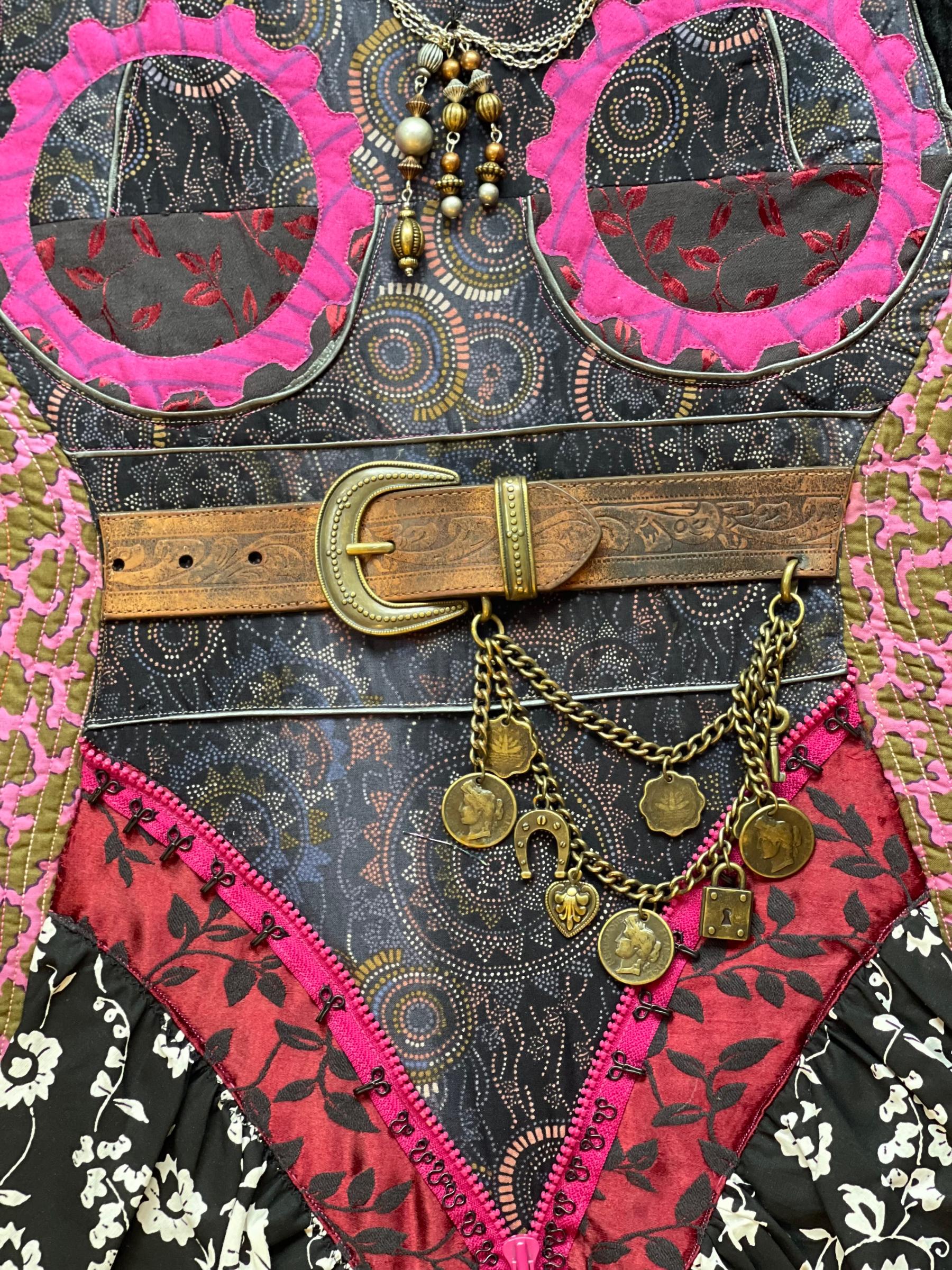 Cotton, organza, upholstery fabric, leather, faux leather piping, zipper, hooks and eyes, snaps, natural and dyed fathers, plastic tape measure, beads