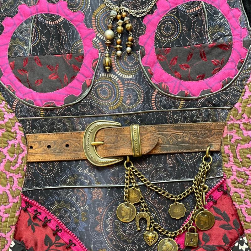 A dress form is a three-dimensional representation of a woman's figure, minus the arms, from shoulder to thighs. It is mounted on a stand and used for fitting garments. I celebrated this tailoring device with mechanics and ornamentation characteristic of steampunk and sewing.