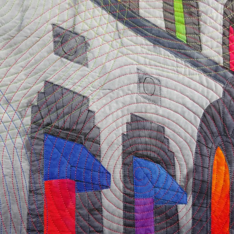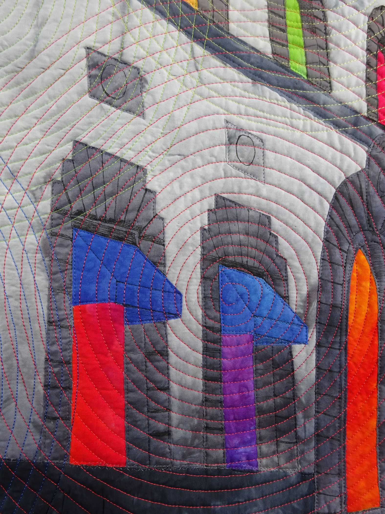 This is a playful depiction of the Drexel Building at 15th and Moravian in Philadelphia, PA. It is a study in perspective to create the the full impact of the structure with correct angles of lines and shapes. I played with the a variety of colors in the windows and the spiral quilting to portray the vibrancy and energy I feel when I walk around this city.