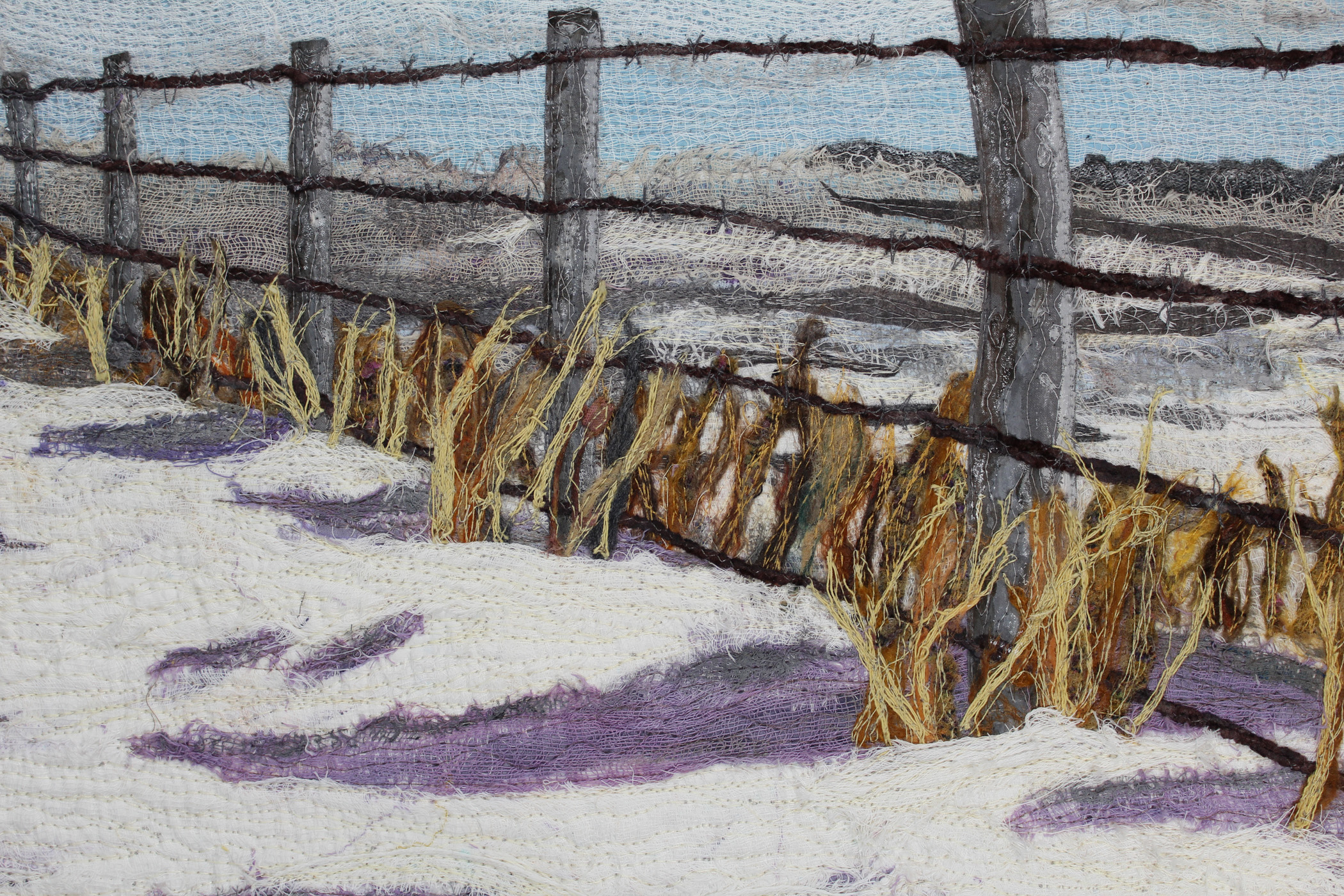 The air is still now, but this field and fence hold drifts of snow from a recent blizzard. The wind has blown and sculpted the snow into shadowed forms, baring the earth in its path.