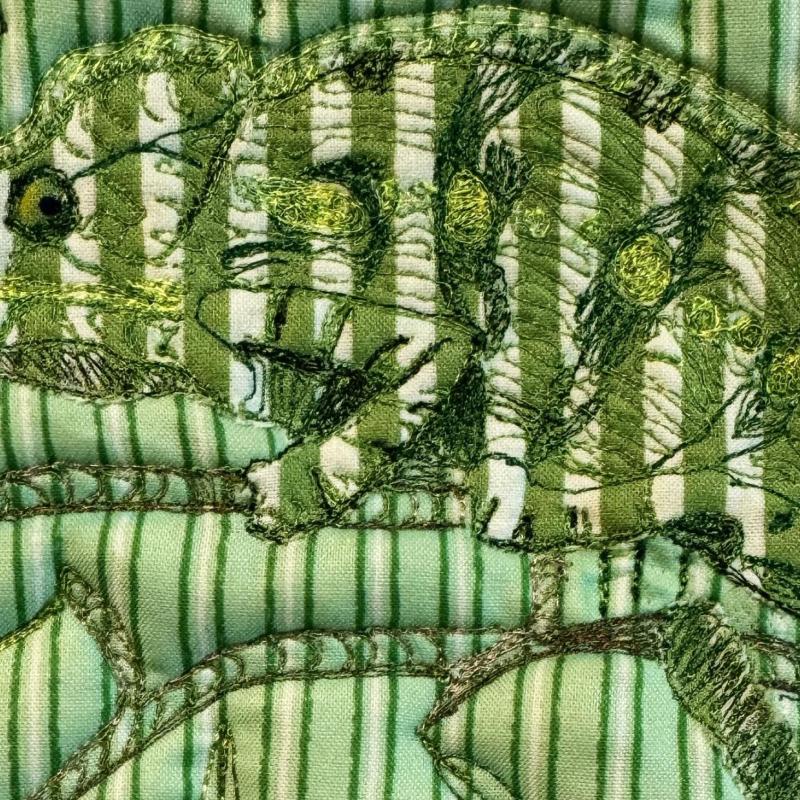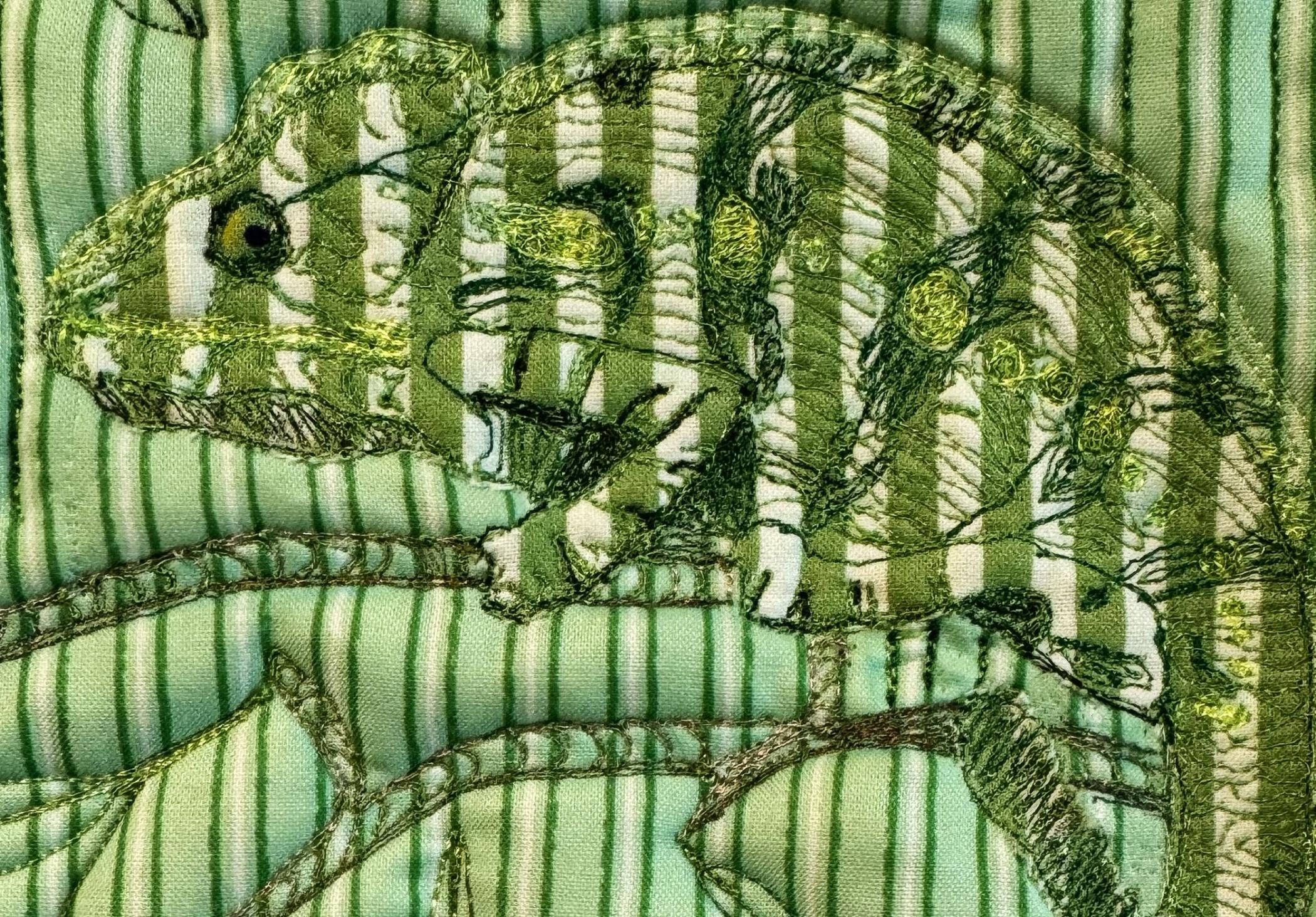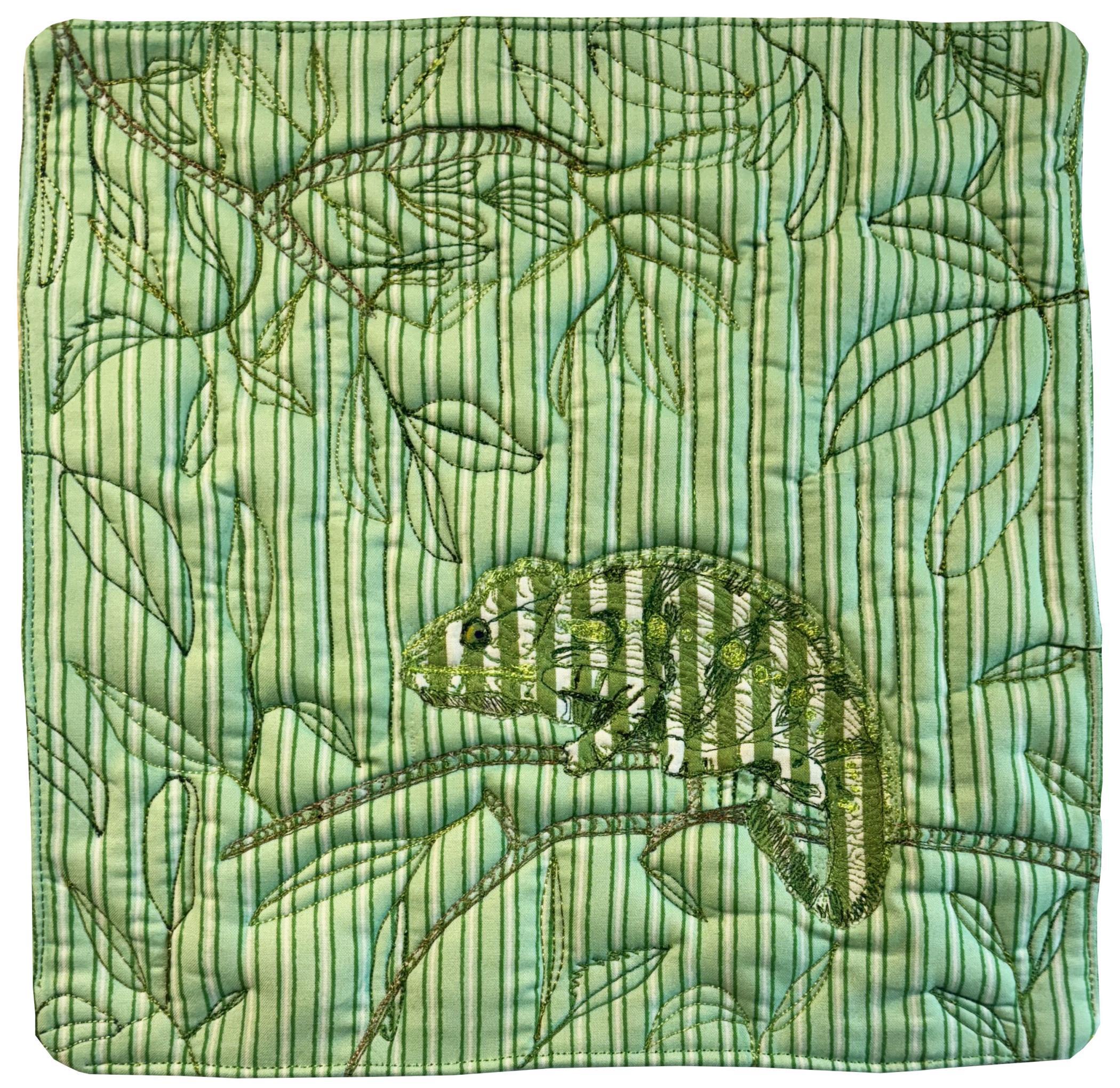 Do you see him? Isn't he cute blending in with a striped environment? A chameleon has a bad rap, says this shy little guy. He blends in with his surroundings so easily, but the stripes come out when he’s feeling aggressive. Chameleons are quite moody.
