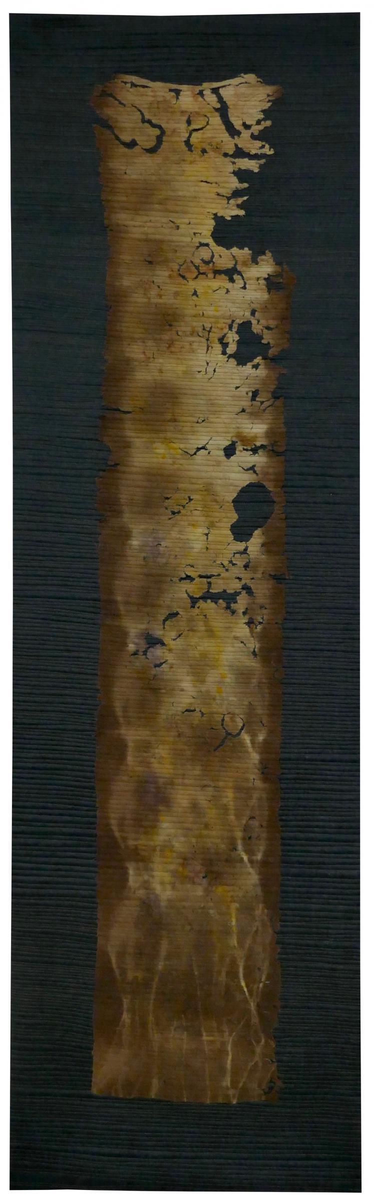 Moths got into my eco-dyed wool stash and had a party. After washing and disinfecting everything, I realized the larval patterns left in the cloth were lovely—organic and soft. It was a beautiful reminder of the cycles of nature, because of course everything returns to the soil sooner or later. This cloth was bundle wrapped and immersion dyed with walnuts, rust, and plants.