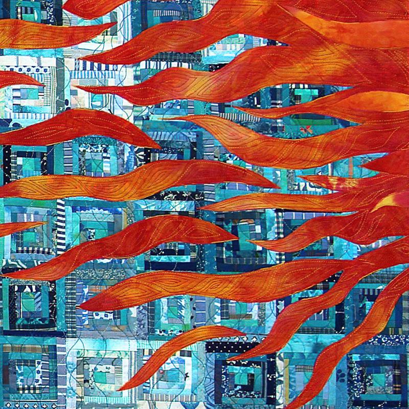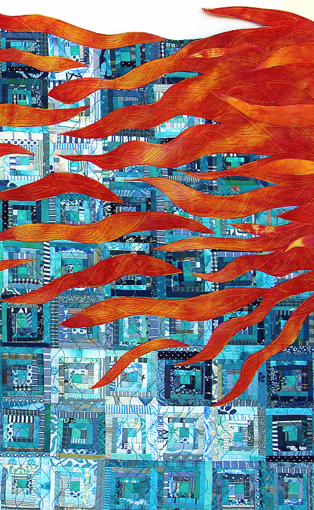 Log cabin, free form, raw edge fused appliqué, machine pieced and quilted