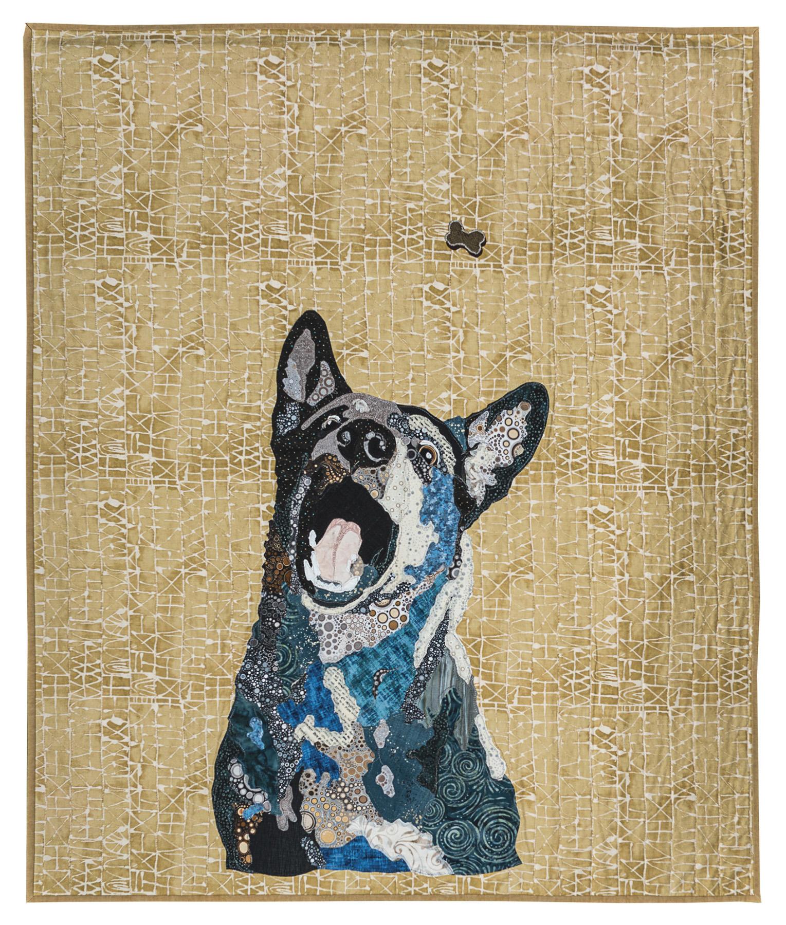 My cousin and her husband, Derek Jordan, are crazy about their rescue dog Ekko. Derek takes wonderful pictures of him doing all kinds of silly things, but my favorite is a picture of him catching a treat. This quilt is based on that picture. Any dog lover understands this. The patient look of anticipation, the focus in the eyes and the final moment when they leap up and snatch the treat from the air. Not only the treat is aloft, but our spirits as well. A happy dog is good for the soul!