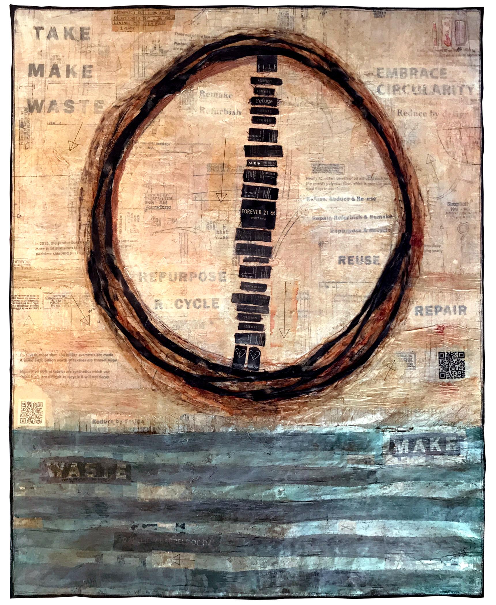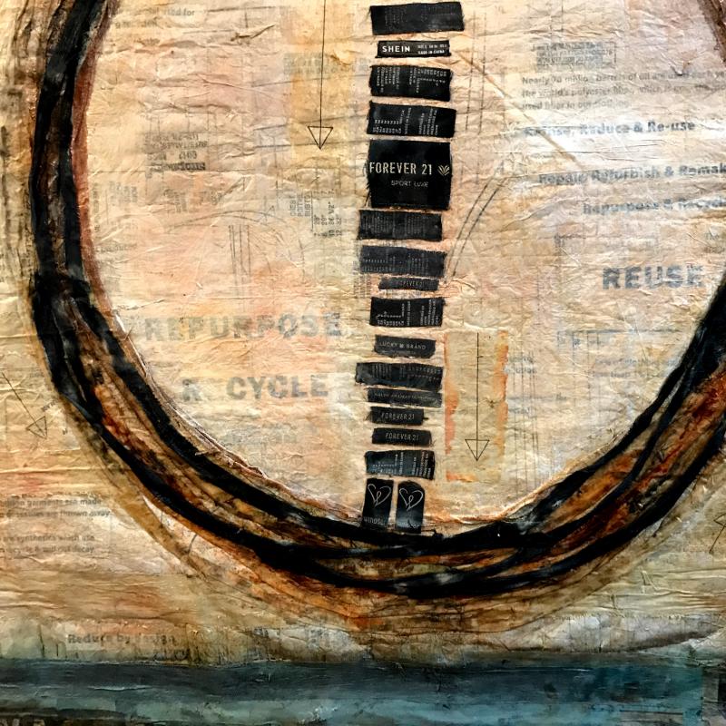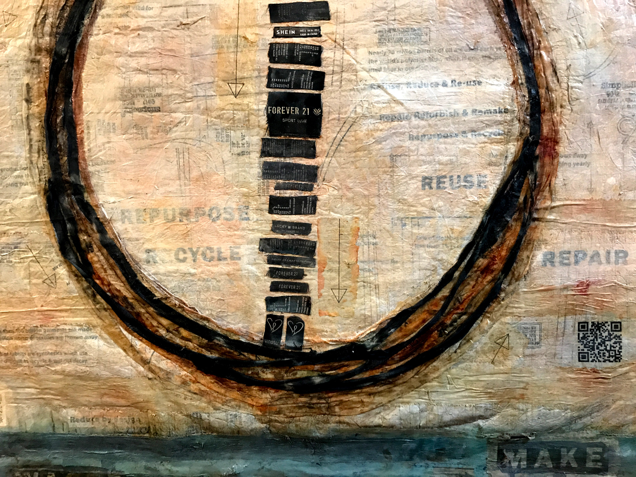 Acrylic paint; repurposed canvas painting tarp, sewing patterns, clothing strips, clothing labels, plastic bags, recycled tissue paper