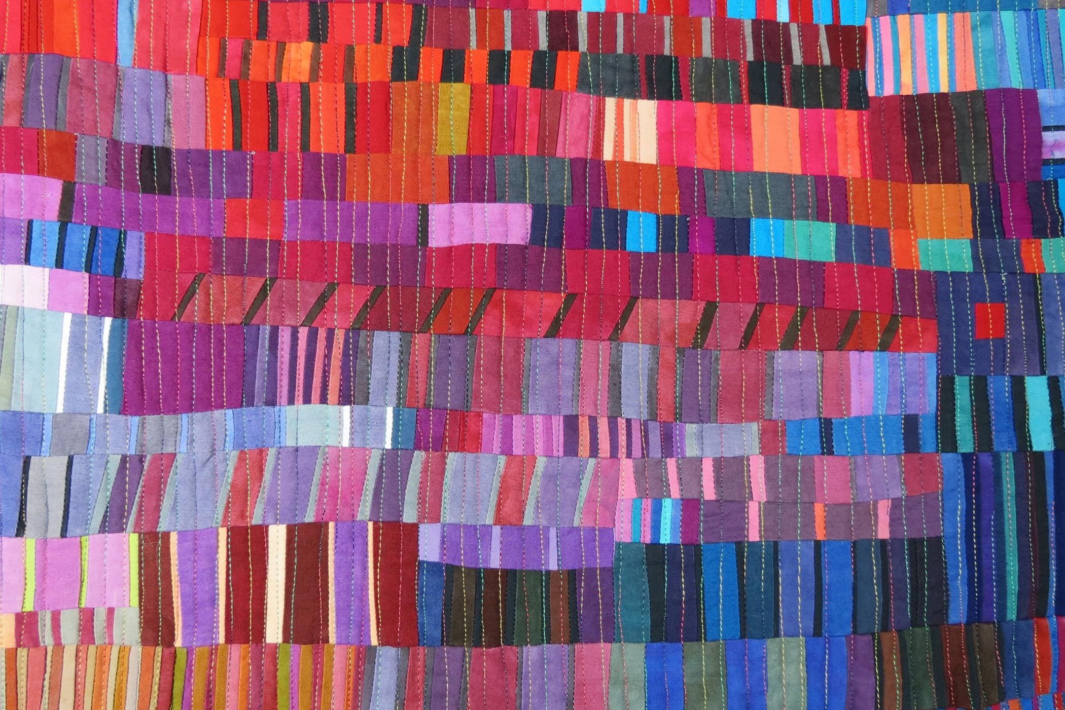 Emergence 2” is composed entirely from strip-pieced fabric made from solid-colored cottons. From a distance, one is reminded of impressionistic images of sunsets and reflections. Up close, the blended colors of the intricately pieced stripes provide the curious viewer with numerous areas of engagement.