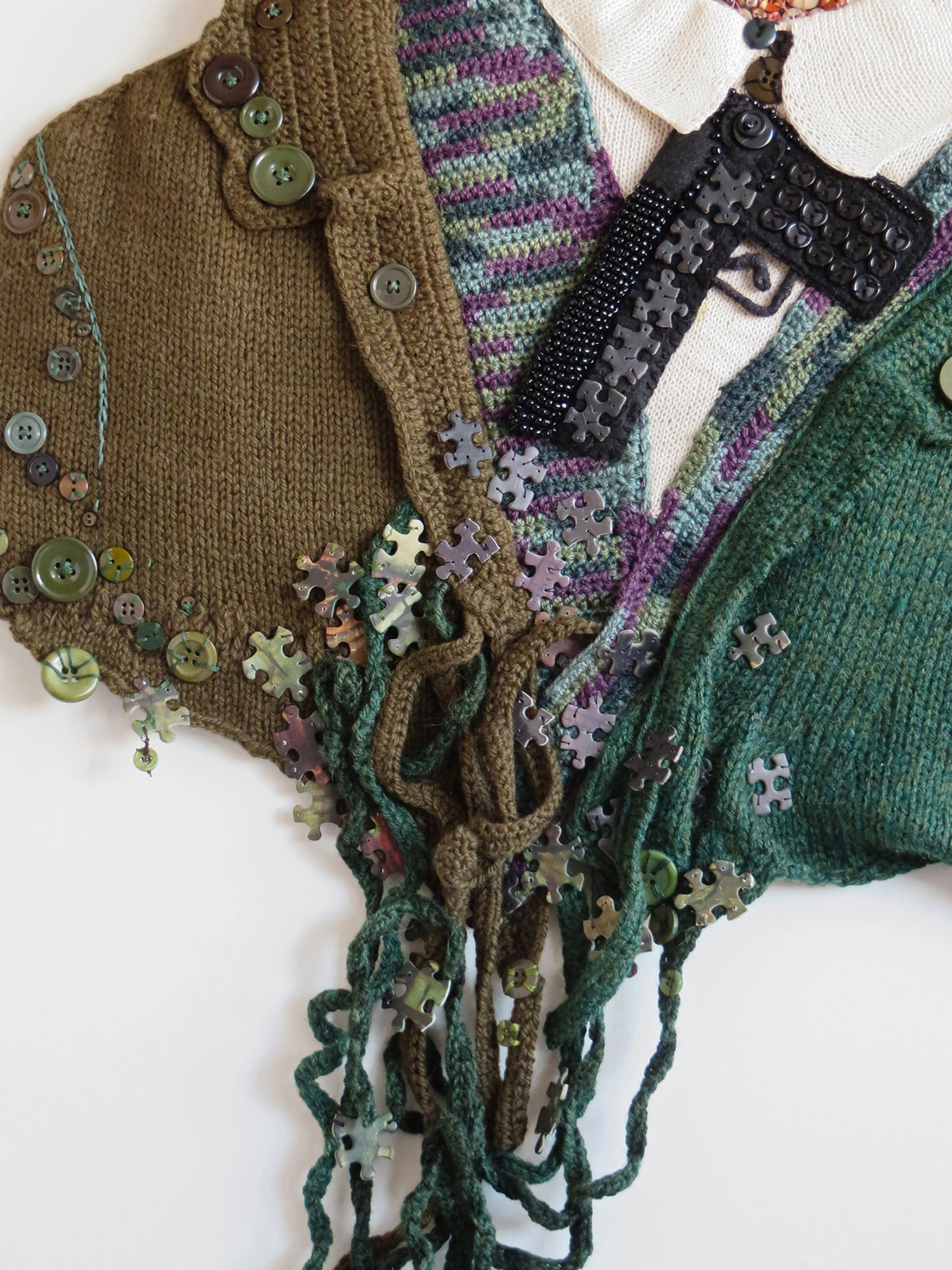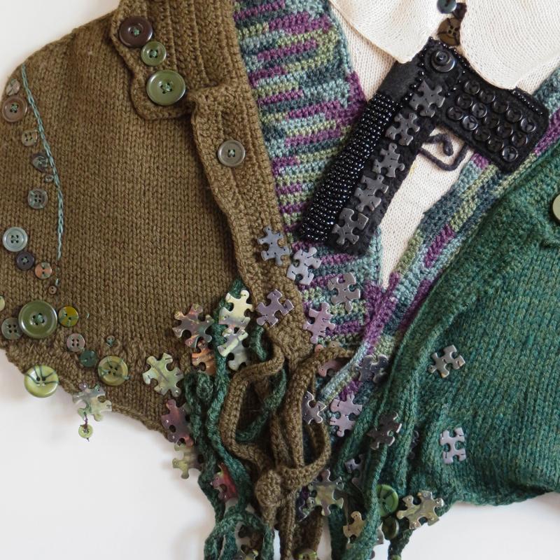 Wool, cotton, alpaca, acrylic, bamboo, beads, buttons, and puzzle pieces. Needlepoint canvas. Wool/rayon felt backing. Polyester and cotton fill.