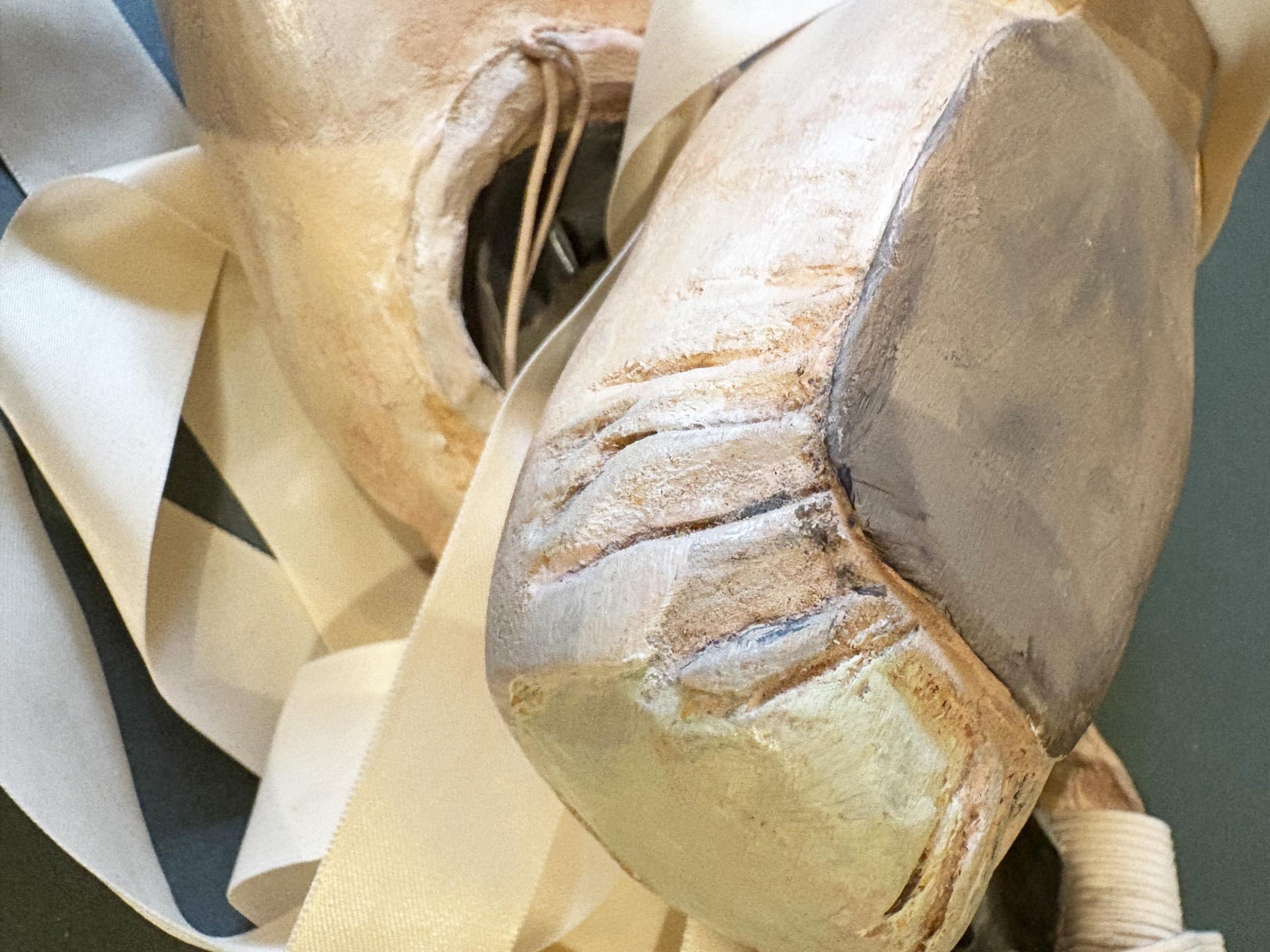 Basswood, paint, wax, satin ribbon, elastic, thread, leather, duct tape