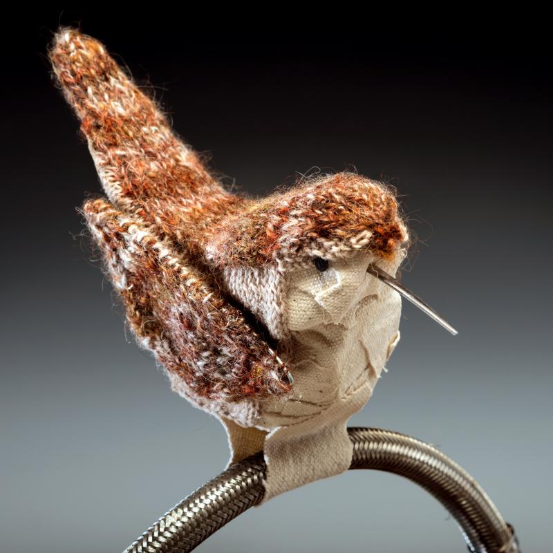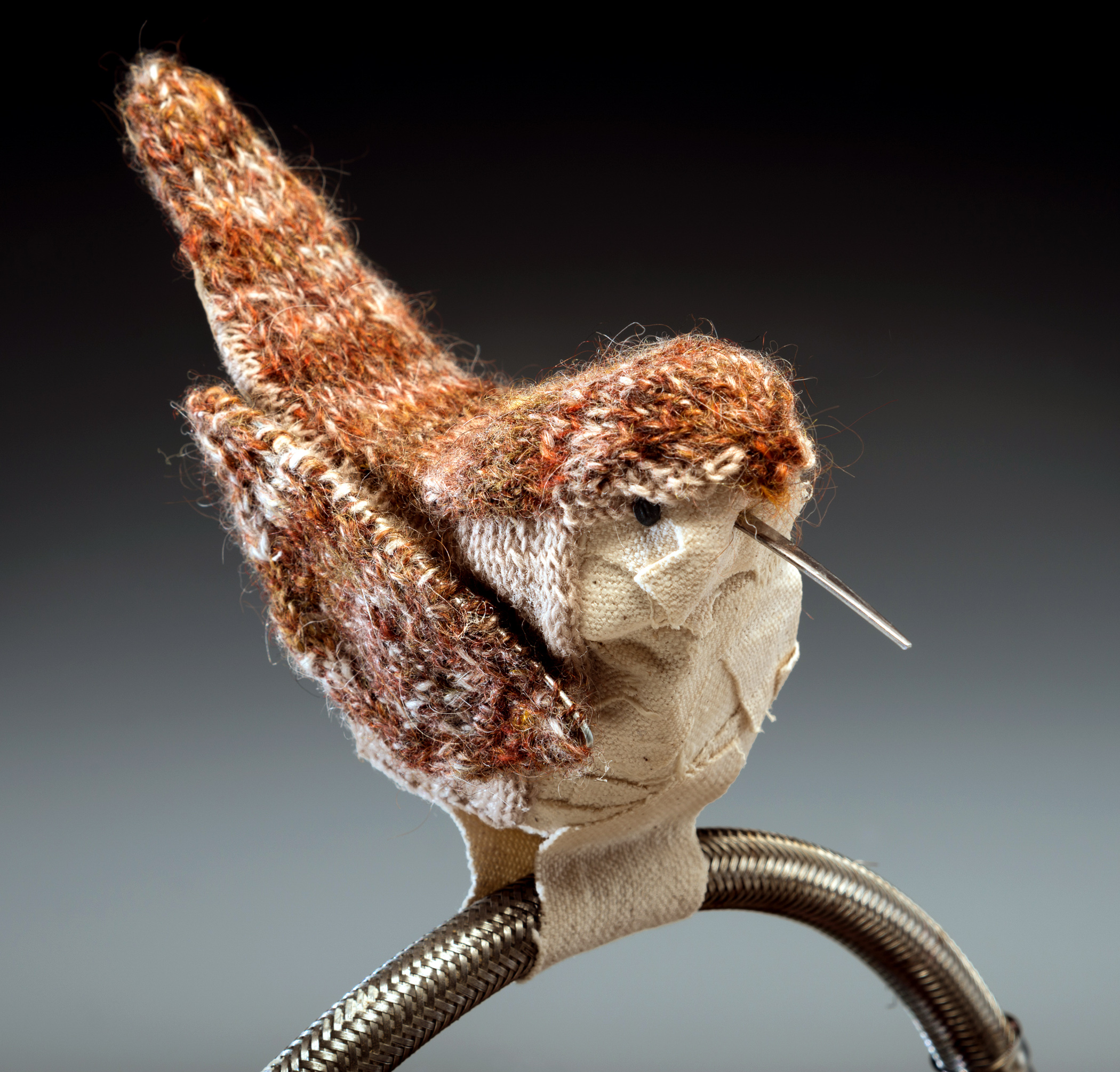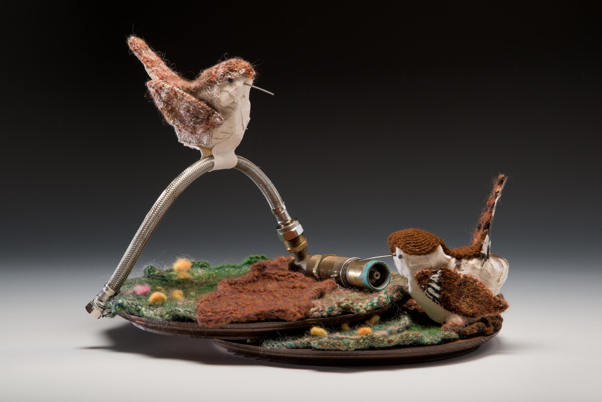I use knitting and yarn in my sculptures to draw people in. These techniques and materials pique curiosity while their familiarity evokes comfort, enabling me to raise serious questions in a gentle voice. The domesticity of yarn elicits a connection between the viewer and this nature scene, suggesting the common threat presented by environmental degradation.