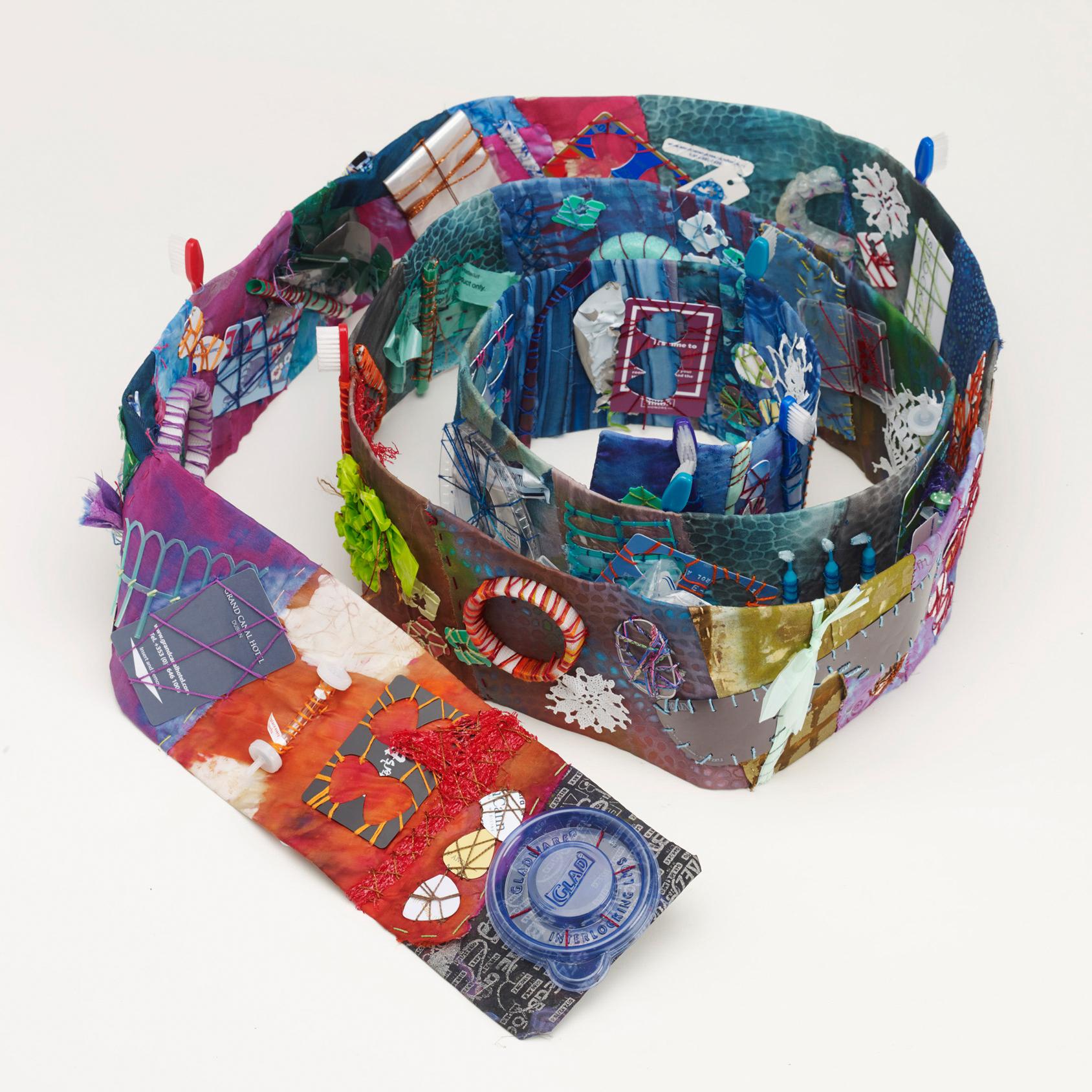 As I became aware of the plastic waste washing up on beaches worldwide, I considered my own consumption. The plastic water bottle was obvious but I was dismayed by the quantity of little pieces of plastic waste in my life, even as I considered myself an eco-friendly consumer. I soon began stitching the waste to fabric, as a visual reminder to cut back. The piece grew and grew and grew as I realized plastic waste, on any scale, is endless…