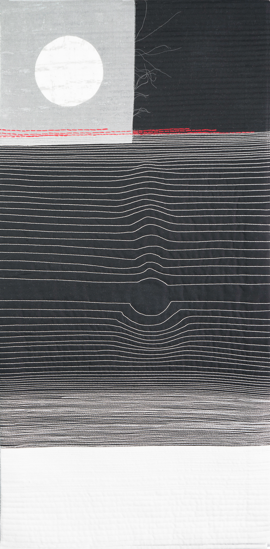 Drawn to particular aspects of 20th-century abstract art, in 2016 I embarked on a series of homages to a select number of artists. I began with Victor Vasarely because I especially love to work in black and white with a touch of red. Inspired by the clean lines and clear spaces of geometry, I intend to continue creating works that are reminiscent of what attracts me to a certain modern simplicity that was achieved with paint, stone, and metal, but which I attempt to achieve with textiles and thread.
