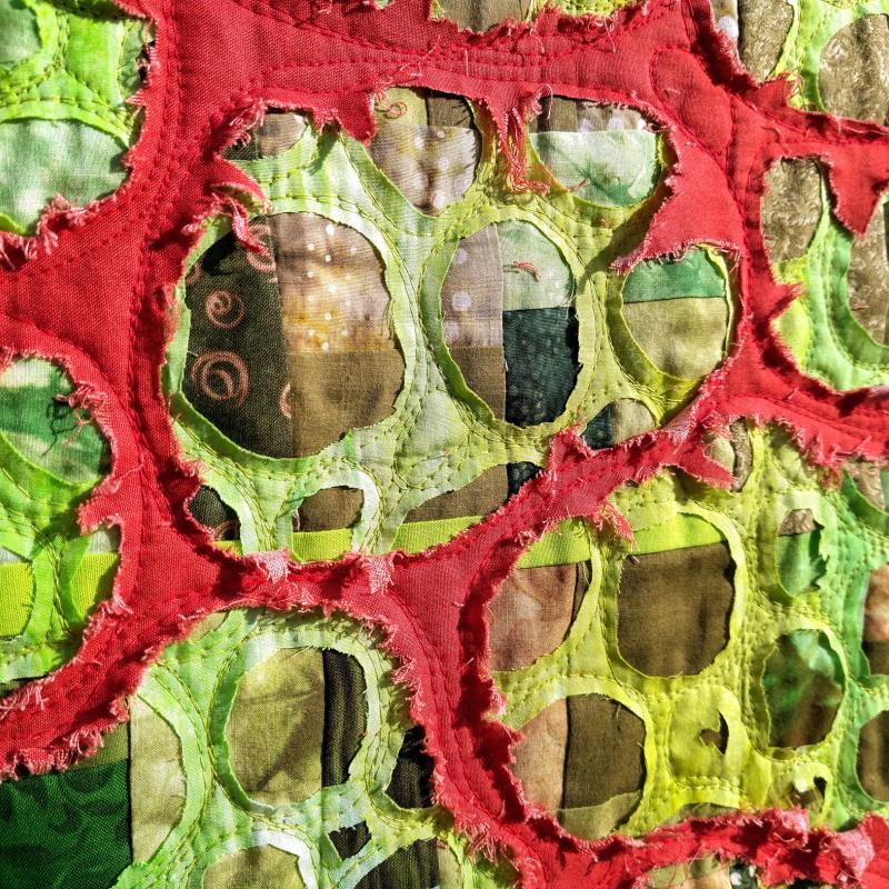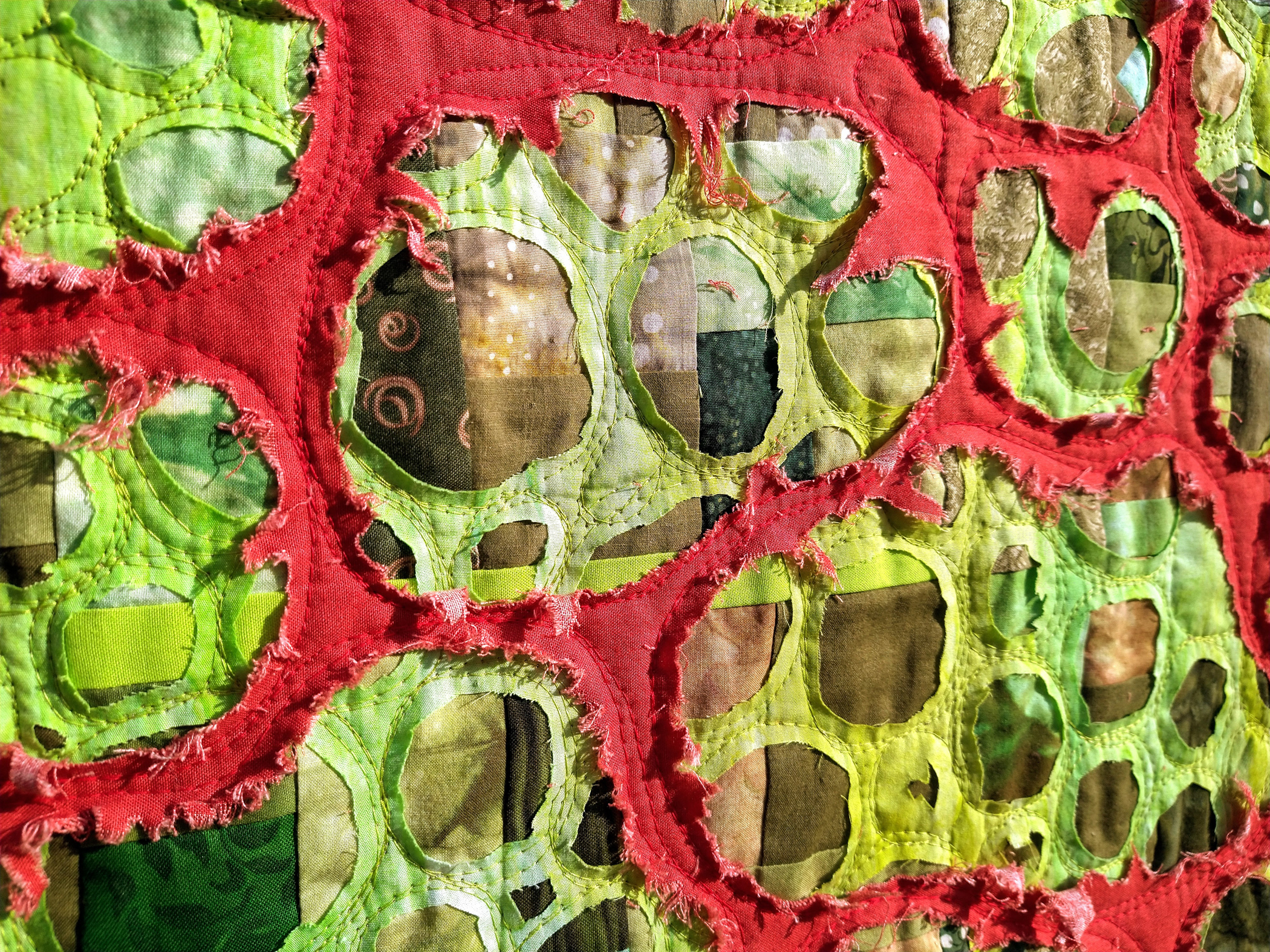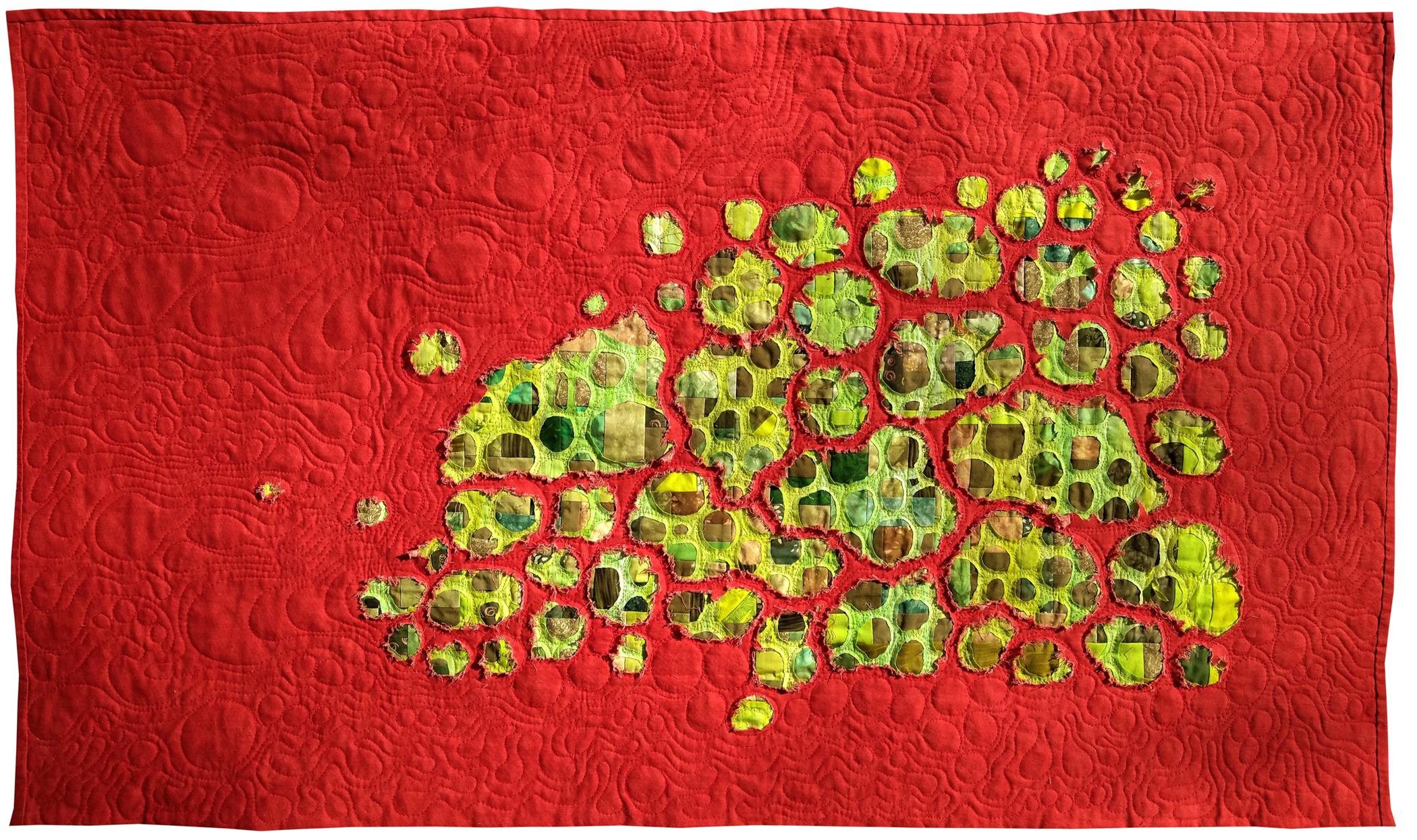 Raw edge reverse appliquéd, machine pieced, quilted