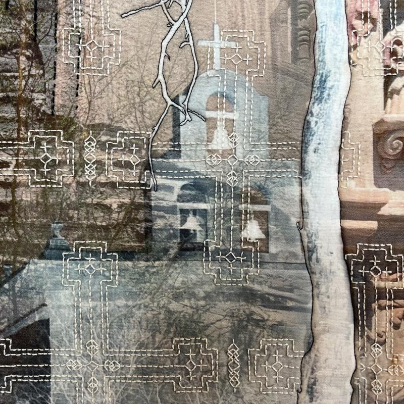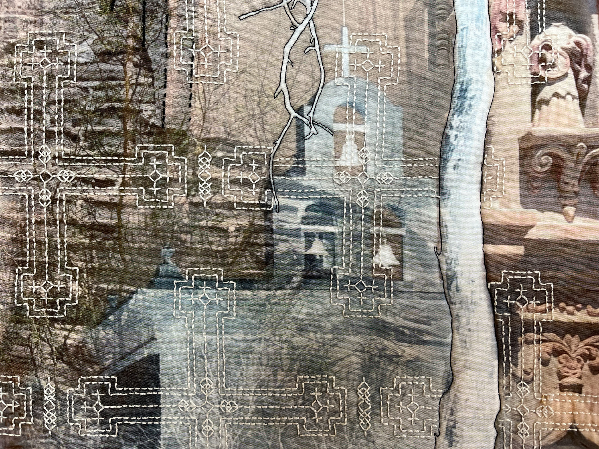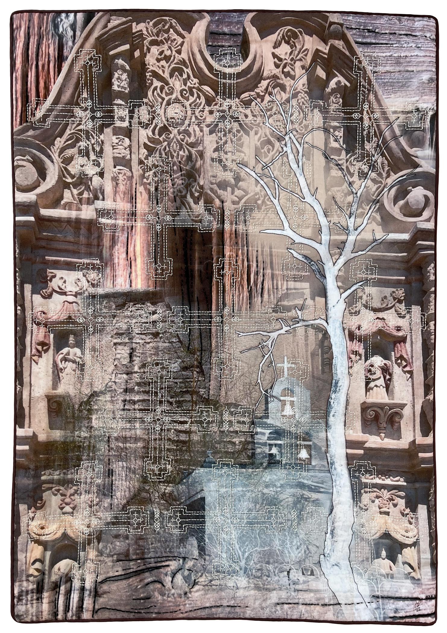 Spanish Catholic Mission San Xavier del Bac, Tucson, AZ, completed in 1797, has been undergoing restoration efforts. The stark white of the newly plastered towers against the weather worn dust brown main facade provided inspiration. Questions of time, erosion, history and loss were evoked but not answered. Religion and symbolism forced their way through.