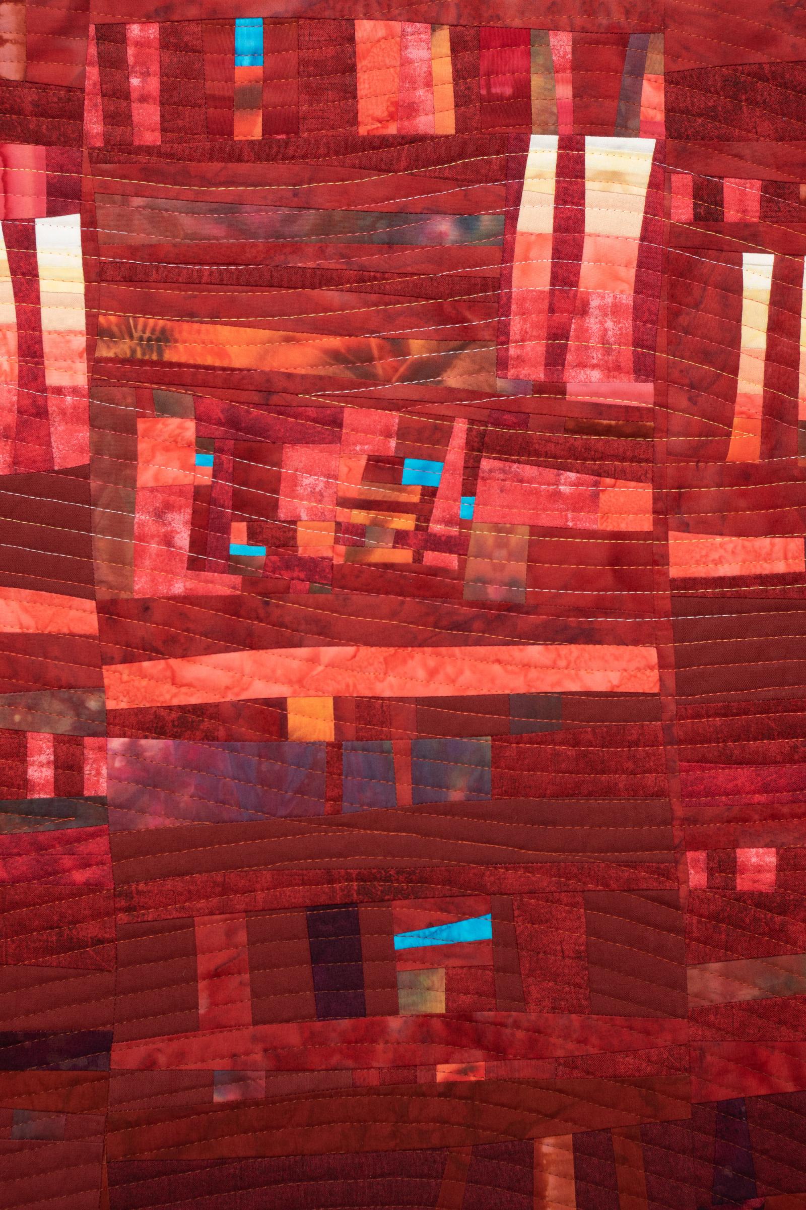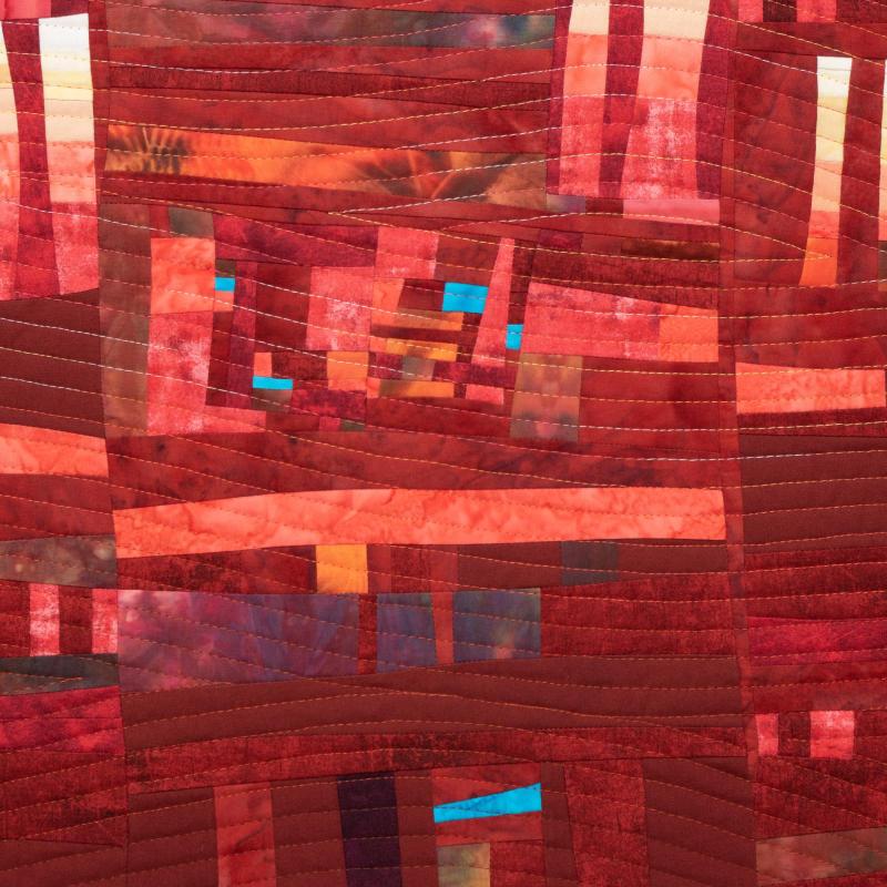 Improvisational cutting and piecing, fused raw-edge appliqué, and stationary machine quilting