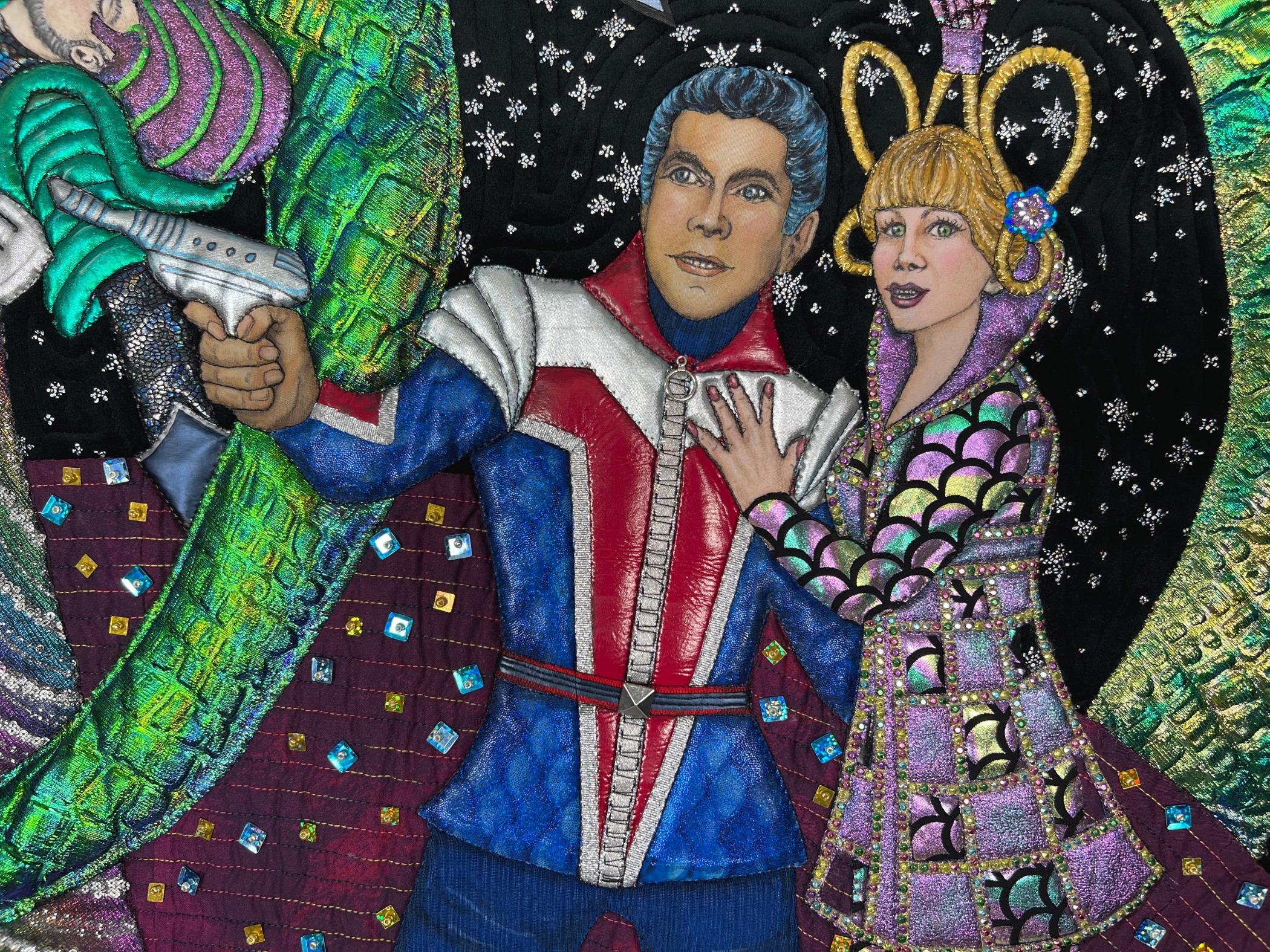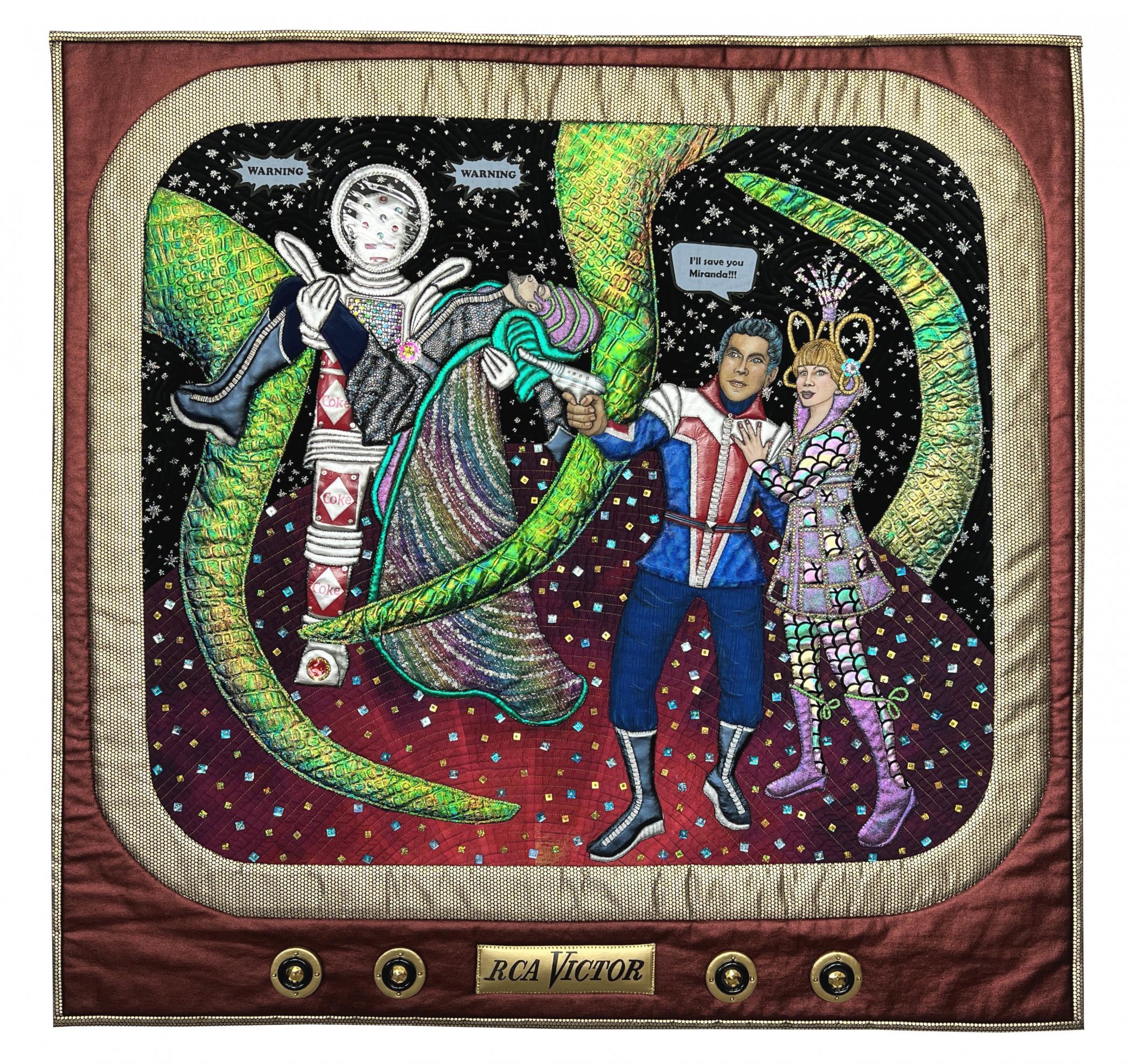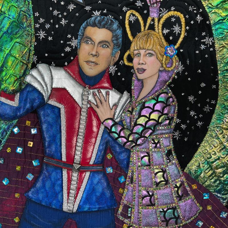 My quilt is based on costumes I designed for the musical Return to The Forbidden Planet. This sci-fi romp is based on the 1950s movie Forbidden Planet, which is based on Shakespeare's The Tempest. As we gathered around our TV sets, we watched with terror as mankind ventured into space to battle the unknown. The robot became a major character, and ours is built out of coke cans and other junk they brought with them. In the fifties, the idea of alien civilizations had us imagining monsters and strange beings from other planets. The 1969 moon landing had us all watching to see if our fears would come true. Who knows as we head toward Mars.