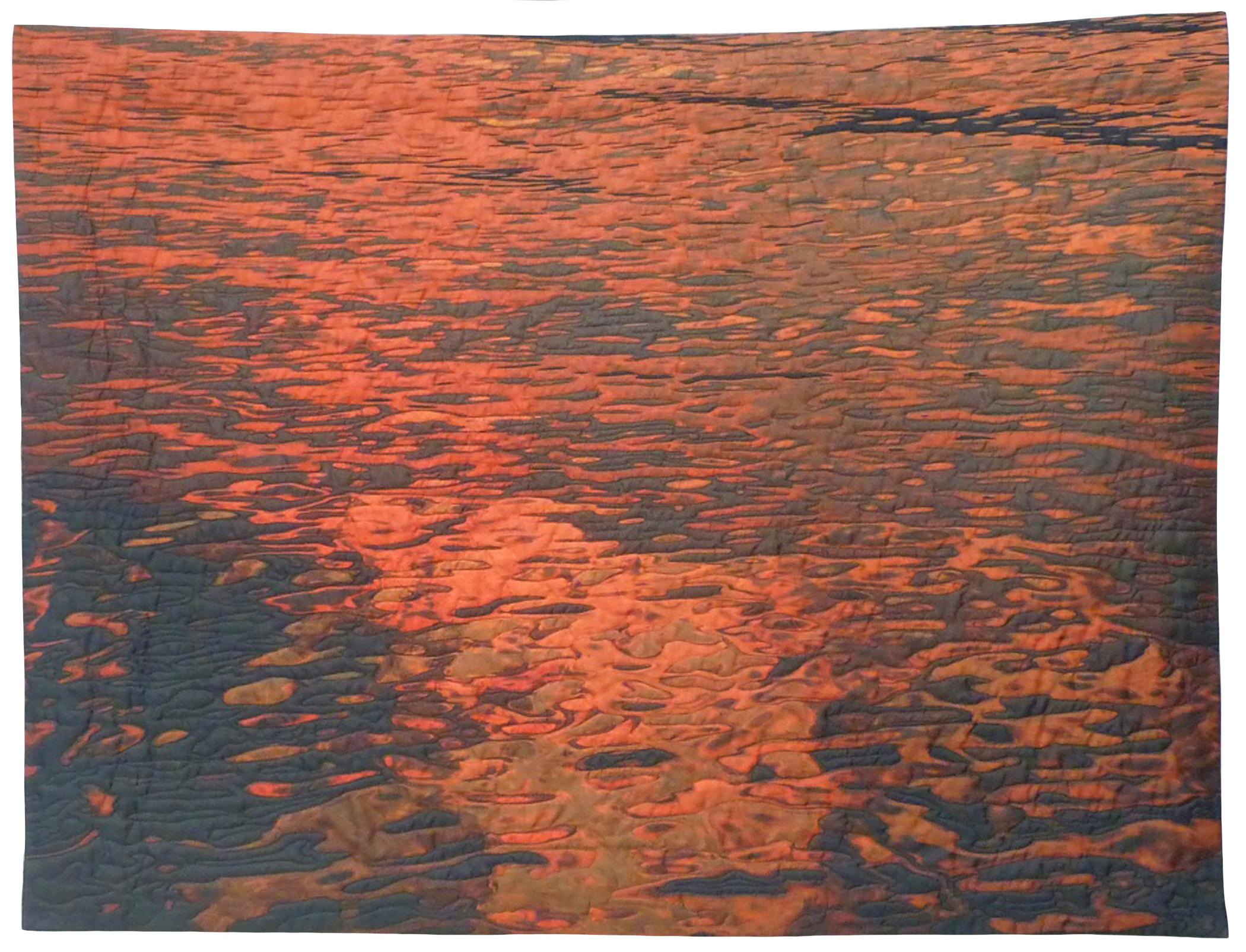This was an evening reflection of the sunset at Shuswap Lake. It was a photo I took and digitally printed it onto fabric. I was sitting enjoying the peace and calm of the water, mesmerized by the water movement and marveling at the sunset colors reflecting on the water and how they constantly change over the course of the evening. As I was quilting it I noticed a face appear in the bottom. Is that my reflection?