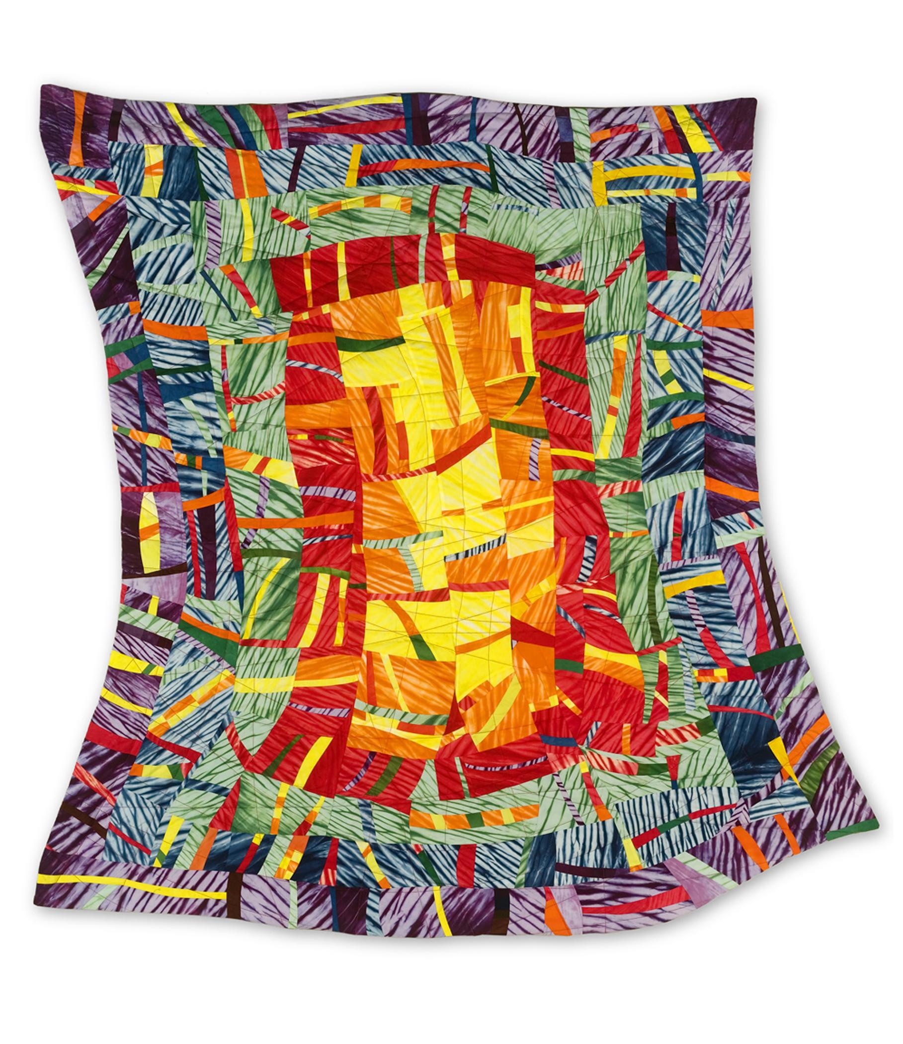 Hand-dyed in the arashi shibori technique, rotary cut, machine pieced, machine quilted