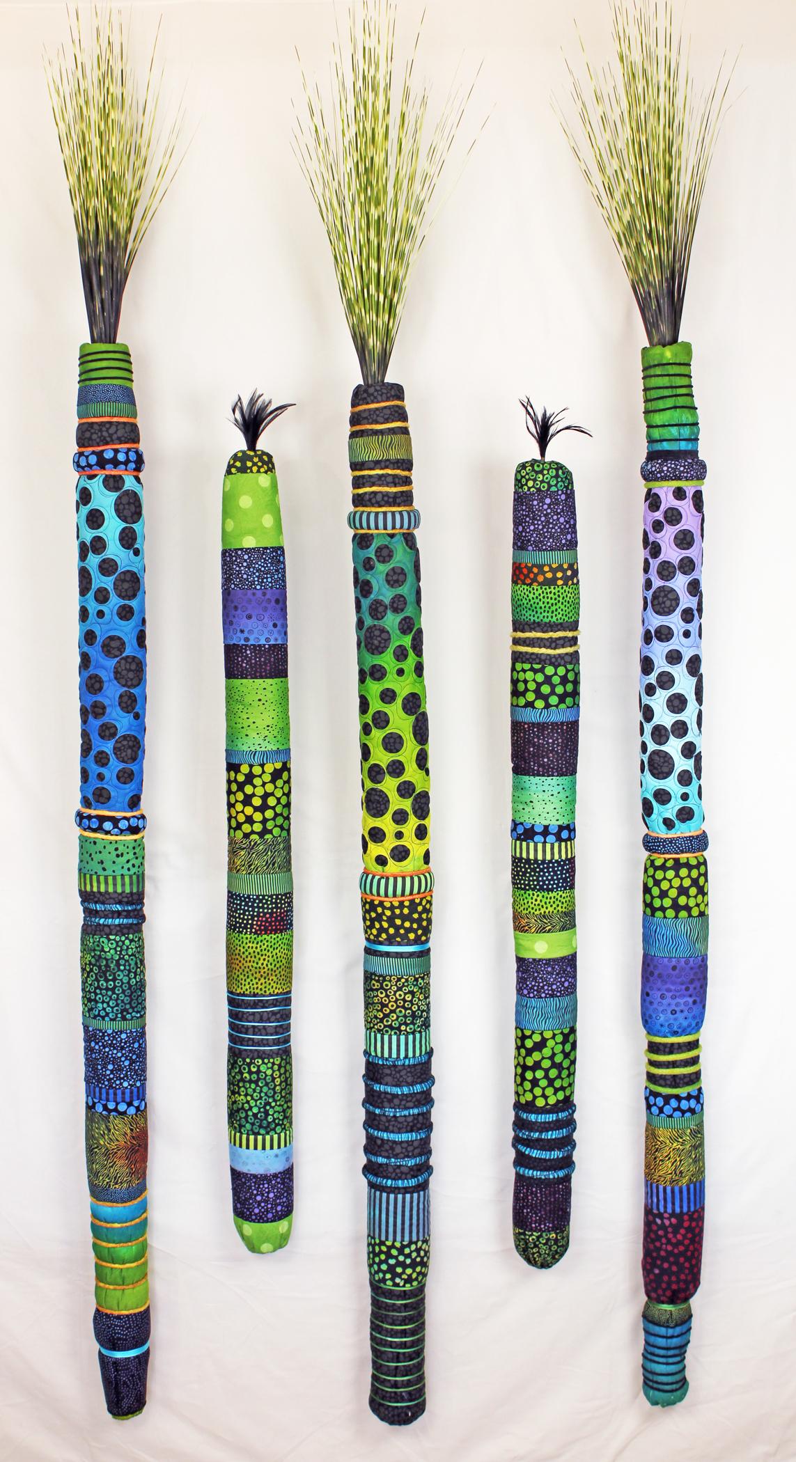 Exclamation is a continuation of my exploration of the cylinder form, which harkens back to my days as a potter. Lots of punchy colors are combined with black patterns, and punctuated with dimensional wrapped cording. It consists of 5 separate shapes mounted by individual brackets on the wall.