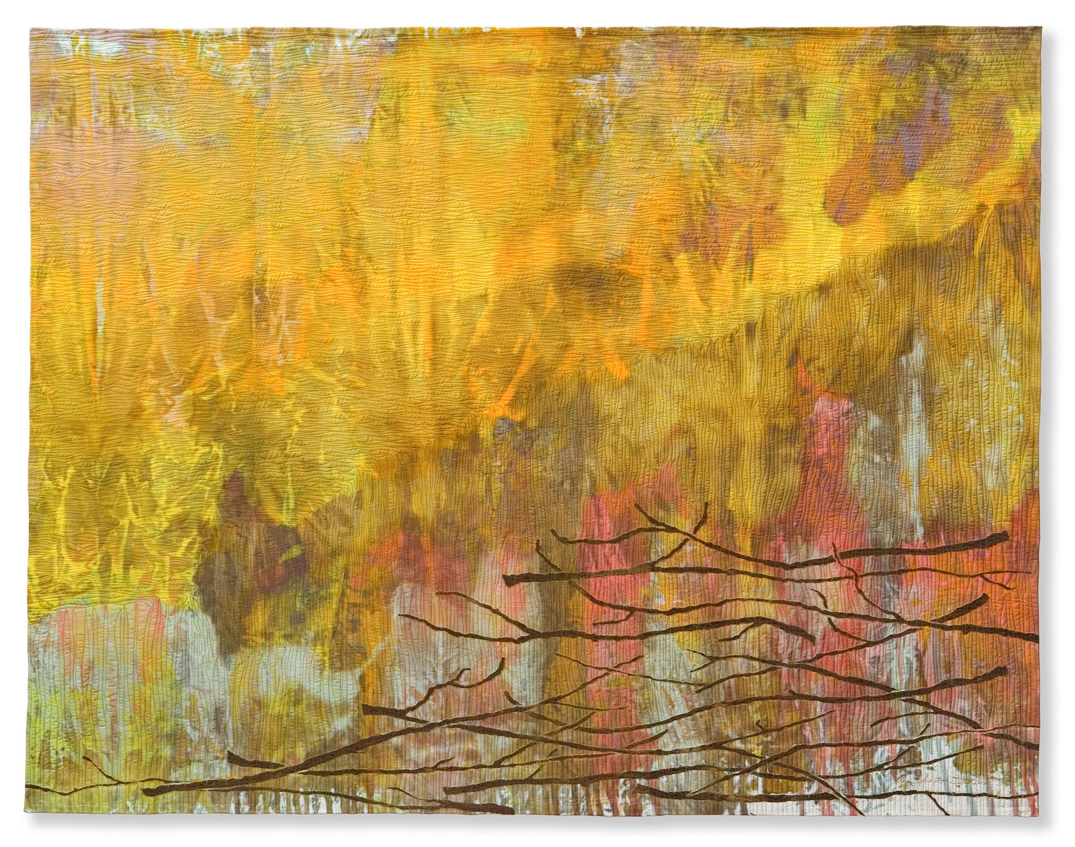 I wanted to make a simple visual statement. The word "fallen" implies more than branches down from trees; it also suggests lives ended. Like a gardener, I am trying to arrange my responses in neat piles. The strong vertical color streaks and the yellow-gold diagonal in the fabric act to pull the focus away from the delicate branches, like a brilliant sunny day does.