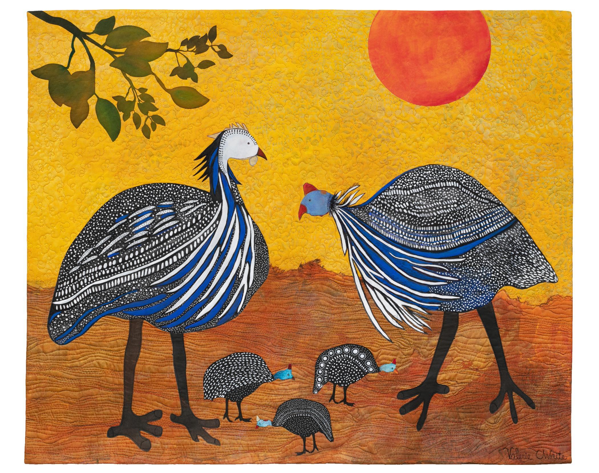 Family Affair was the first piece I created in the guineafowl miniseries. The Royal East Africa Vulturine guineafowl is the largest and most unique species of guineafowl. For me these stately birds hold an allure that is both magnificent and complex. I’m drawn to and amazed by their coat and color. The long lance-shaped feather stripes of brilliant blue, white and black are truly exquisite! I believe this kind of beauty only comes from a power greater than myself.