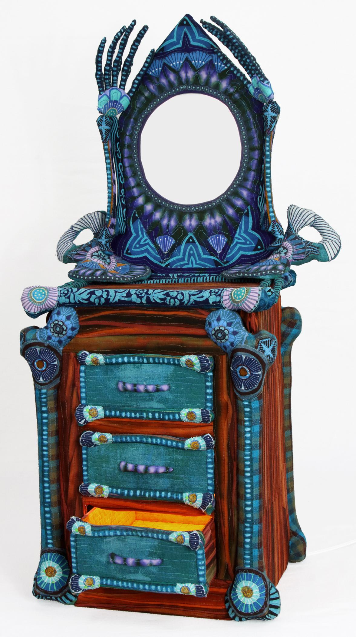 In this dresser made of cloth-covered bones, light peeks from an open drawer. This is the latest in a series called Heirlooms, which examines ideas of mortality, our human past, family histories, and the meaning of domestic objects handed down through generations.