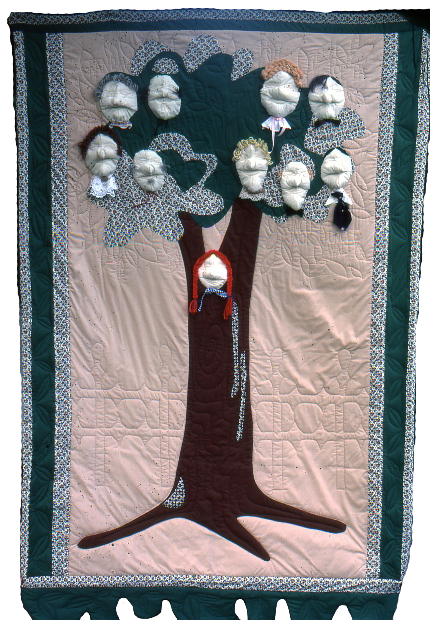 One of the first quilts I ever made, inspired by the soft sculpture fiber work of the late 1970's. Original design and was the Texas winner in that year's (1978) Fairfield Batting Company's national competition for quilts about family.
