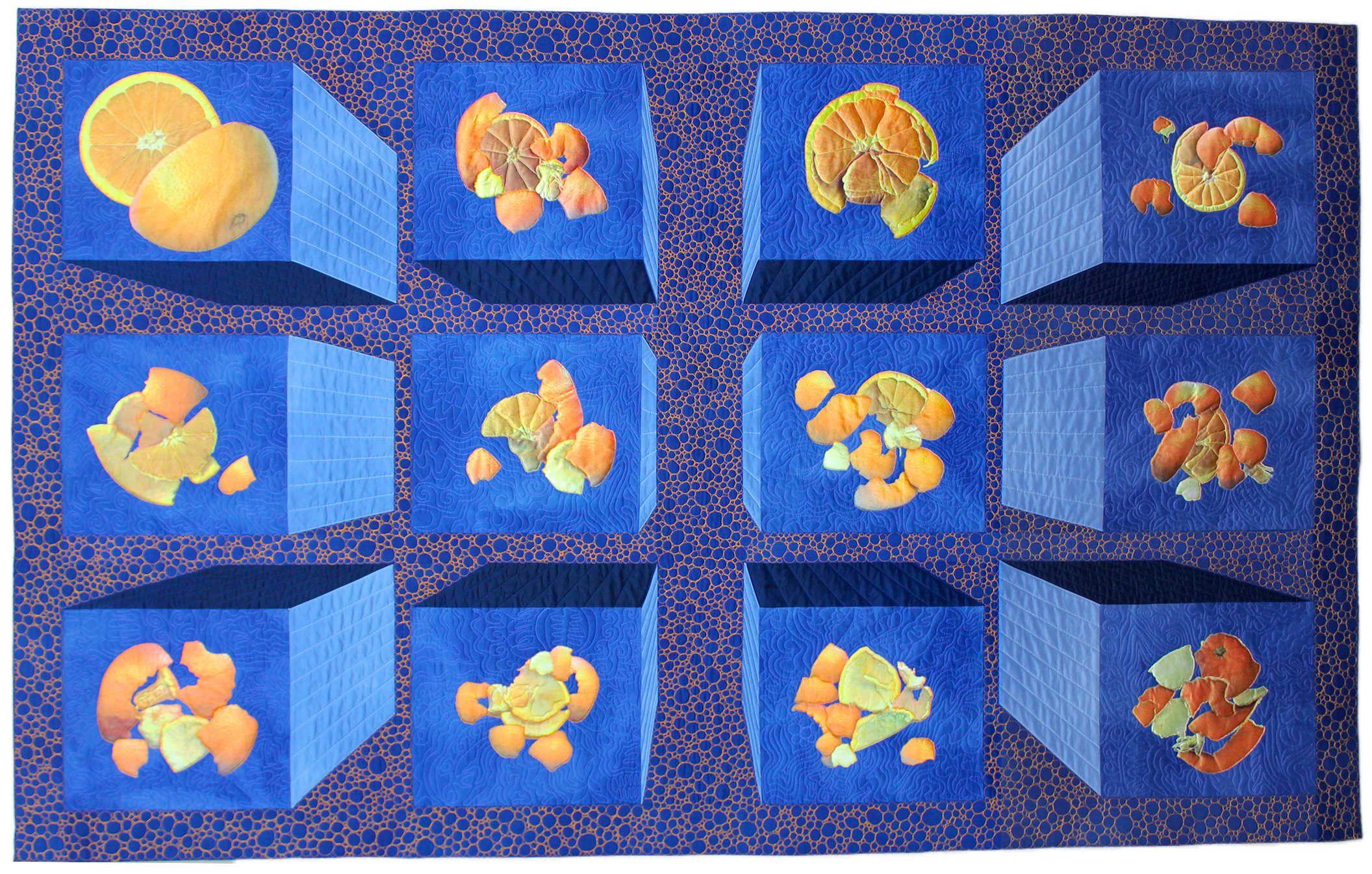 I scanned an orange as I ate it, capturing it at various stages of decomposition, and even re-scanned it a few days later after the remaining skin had dried out. I transferred these images to fabric, but didn't know what to do with the images. One day I reached back to my early days of quilt-making when I did quite a few op-art quilts, and decided to combine the two ideas. I dyed the blue silks a number of times to get the proper depth of shade. I got the idea to quilt all the little oranges on the background to make it stand out. At this point I joined a quilt guild, and when I showed my work, no one responded, while they all responded to the traditional quilts, so eventually, I left the guild, and continued doing my own thing, connecting with some people on the internet, including SAQA. Ironically later, after the popularity of SAQA and the art quilt movement, the same guild invited me to have a special exhibit at their annual quilt show!