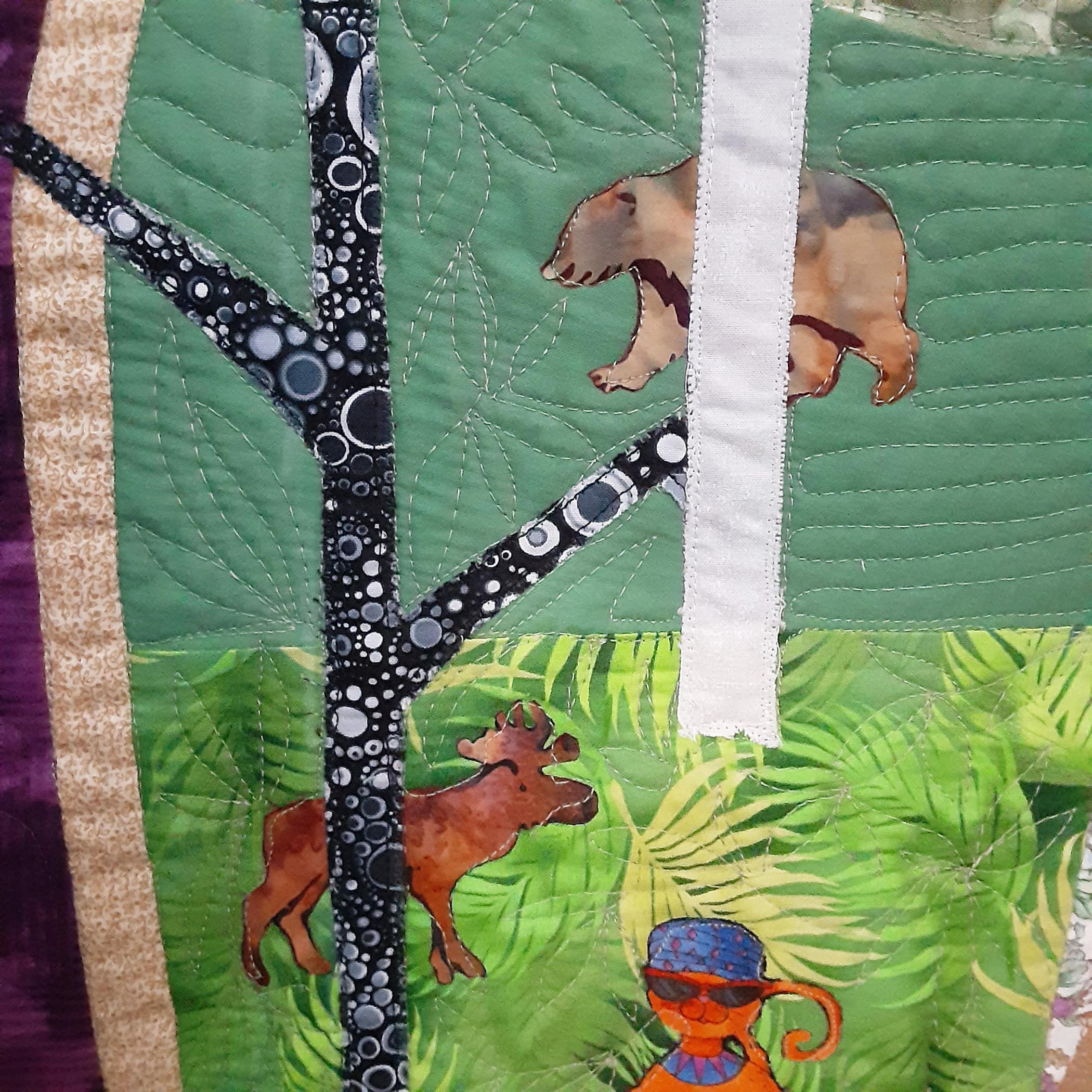 Fantasy animals, trees, and butterflies were appliquéd onto pieced floral, printed, and plain fabrics for this whimsical quilt. The main subject of the quilt is encircled with a contrasting fabric in an irregular shape. The purple border contrasts and emphasizes the central subject.