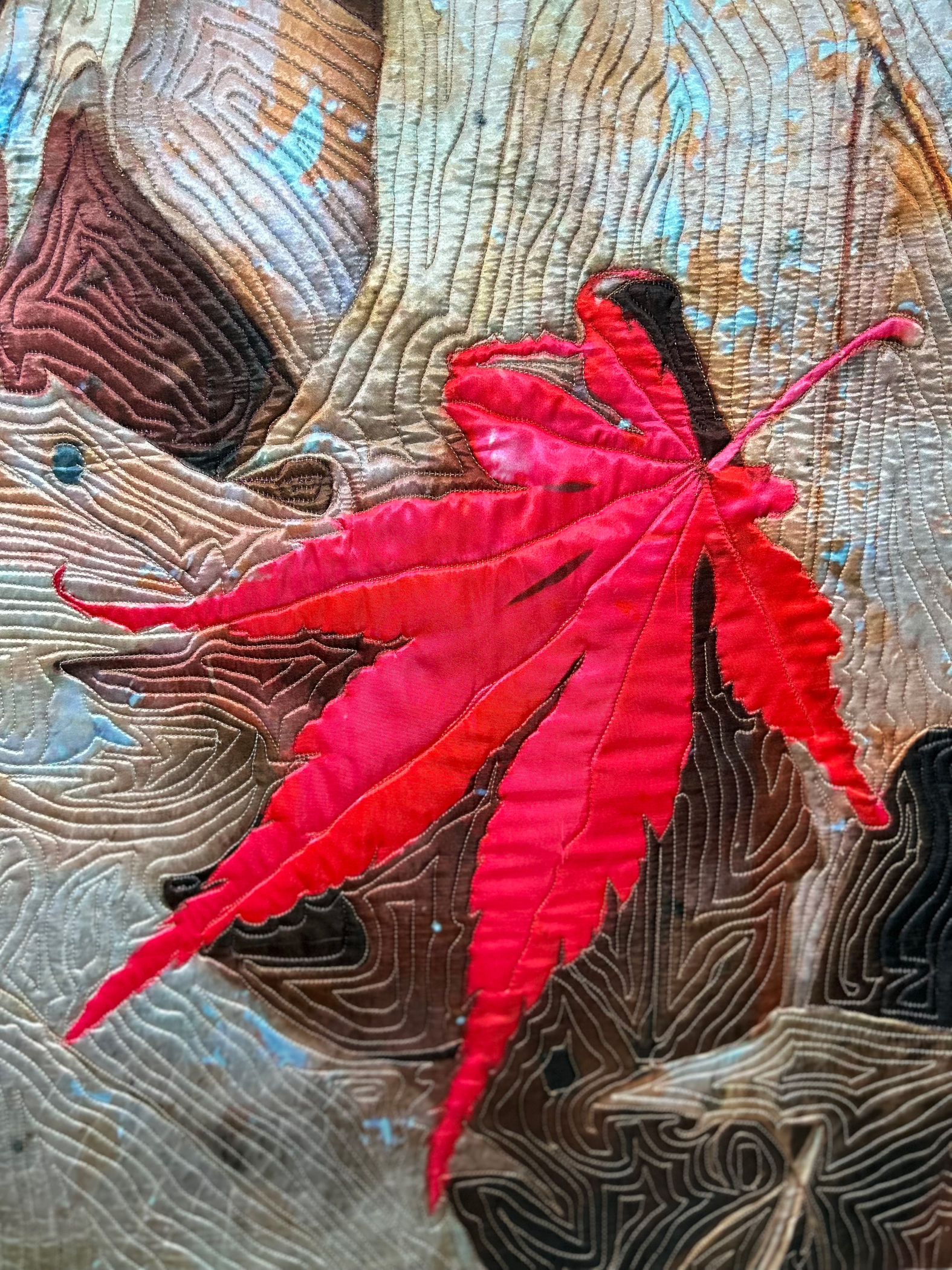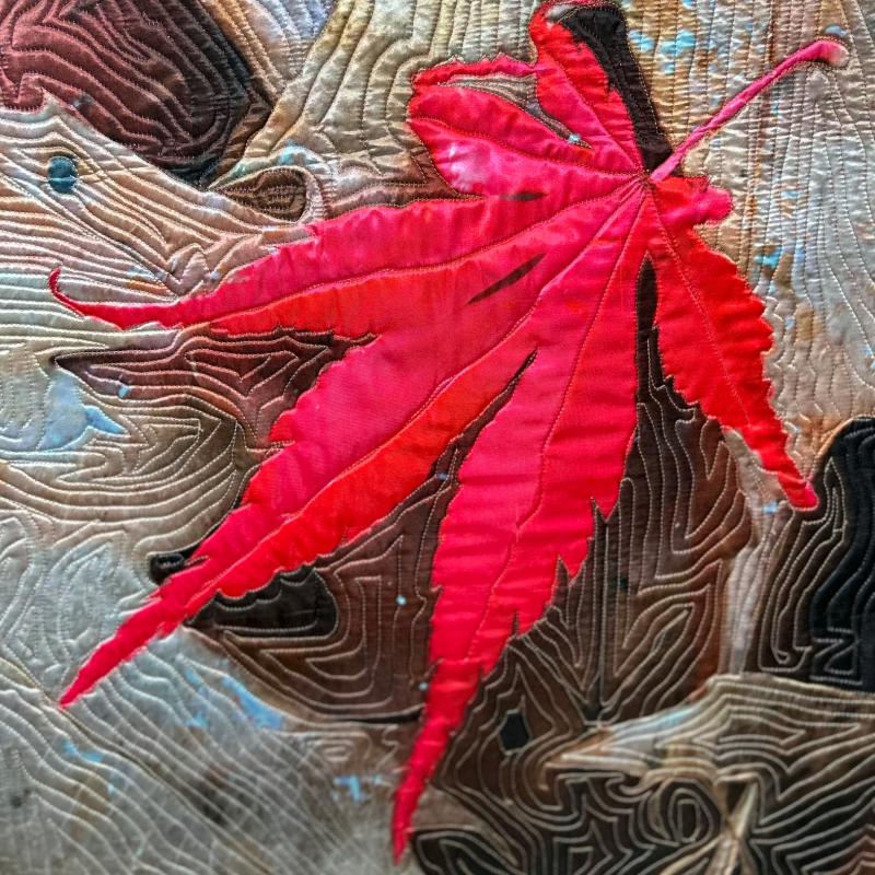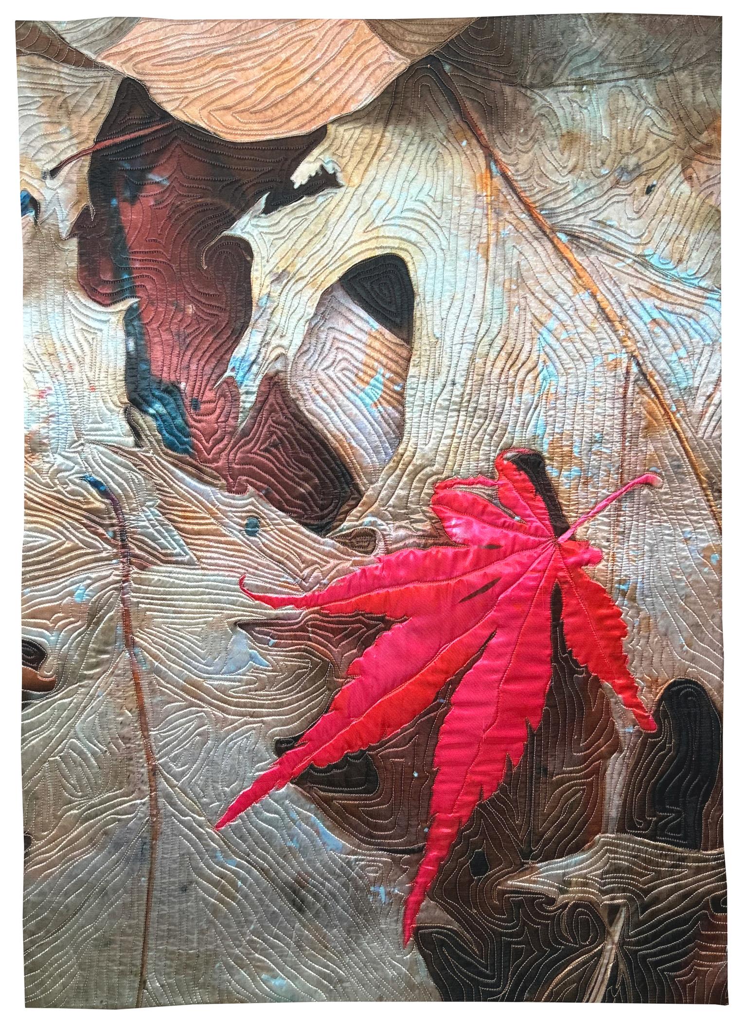 Browse the Collection Farewell Blaze Stephanye Schuyler Size 34 in x 24 in (86 cm x 61 cm) Year 2023 Exhibition Color in Context: Red (SAQA Global Exhibition) Price $0.00 Buy Now >> With a final bold, brilliant blaze of crimson, this Japanese Maple leaf rests on a bed of dull oak leaves, soon to decompose then reincarnate. Materials Satin, felt, cotton Techniques Photo edited, photo transferred, machine quilted