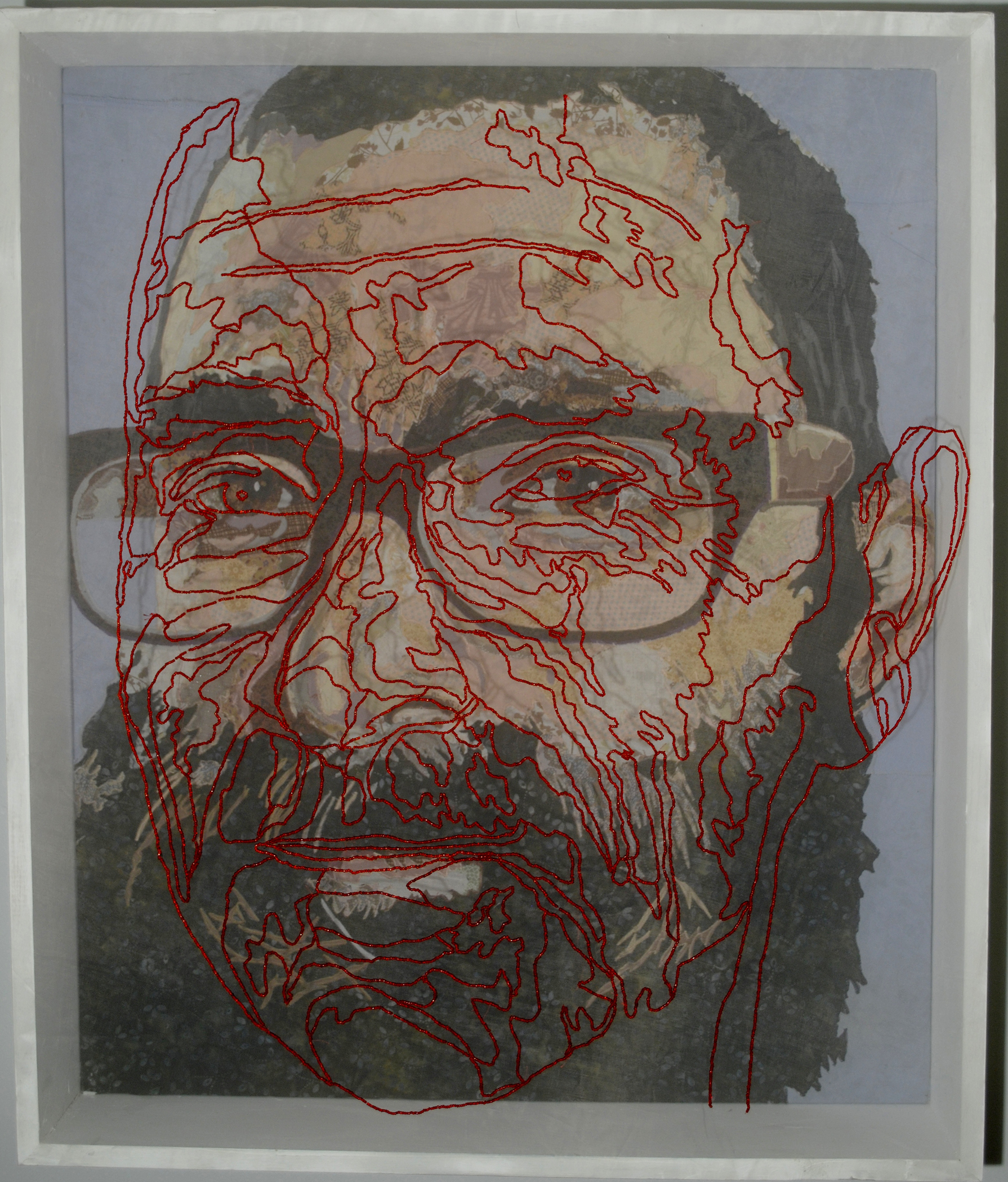 This piece is an appliquéd raw edge self portrait. I then inset the quilt into a 6 inch frame. The frame is wrapped in organza that was hand beaded with a contour drawing of my father. This allows the viewer to see the similar hereditary characteristics. The beads also casts the appropriate shadow on myself