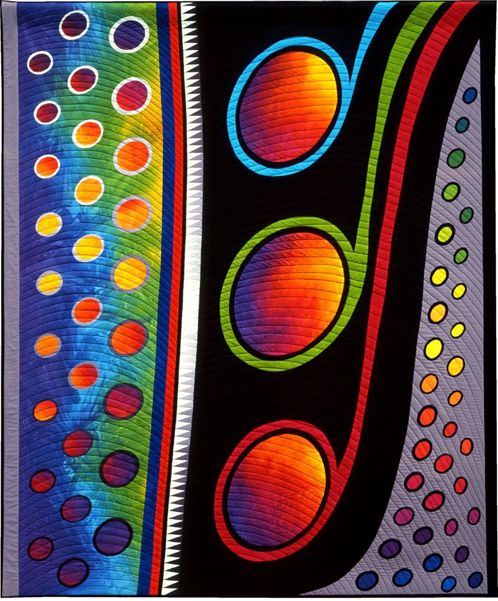 The quilt is pieced and appliqued using hand painted and gradation dyed fabrics. On the left side, the background is a fabric painted with a gradation of purple, blue and green. The eliptical dots are graduated from purple to red, to orange, and gold. These dots are surrounded by rings that graduate from black to gray to white. In the center the background is black, with three large elipses in the colors of fire. The background on the right side of the quilt is medium gray, with smaller, eliptical dots, surrounded by rings of black. Separating the colored background fabric and the black background fabric, are several, vertical, solid colored stripes, and a single sawtooth stripe that graduated from black and white at the top and bottom to gray and white in the center of the quilt. The quilting pattern is a series of curving lines at one inch intervals, representing the individual vanes of the feather. These lines emerge from the vertical center stripes, which represent the center shaft of the feather.