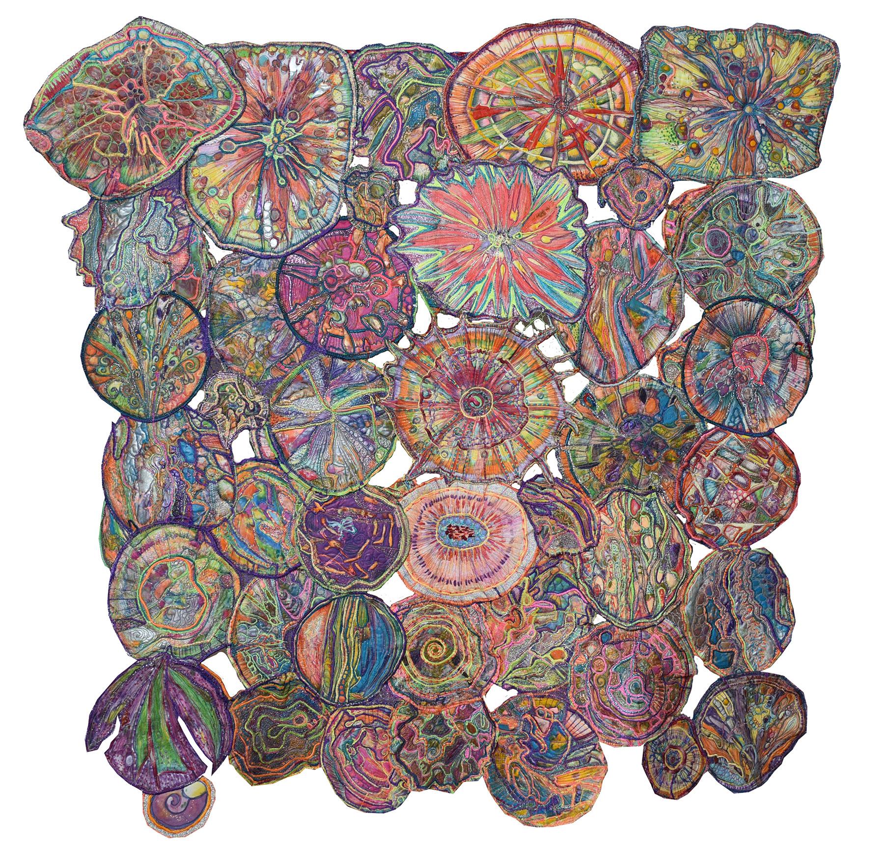 Cotton, textile paint, felt tipped pen, gel pen, colored pencil, embroidery floss