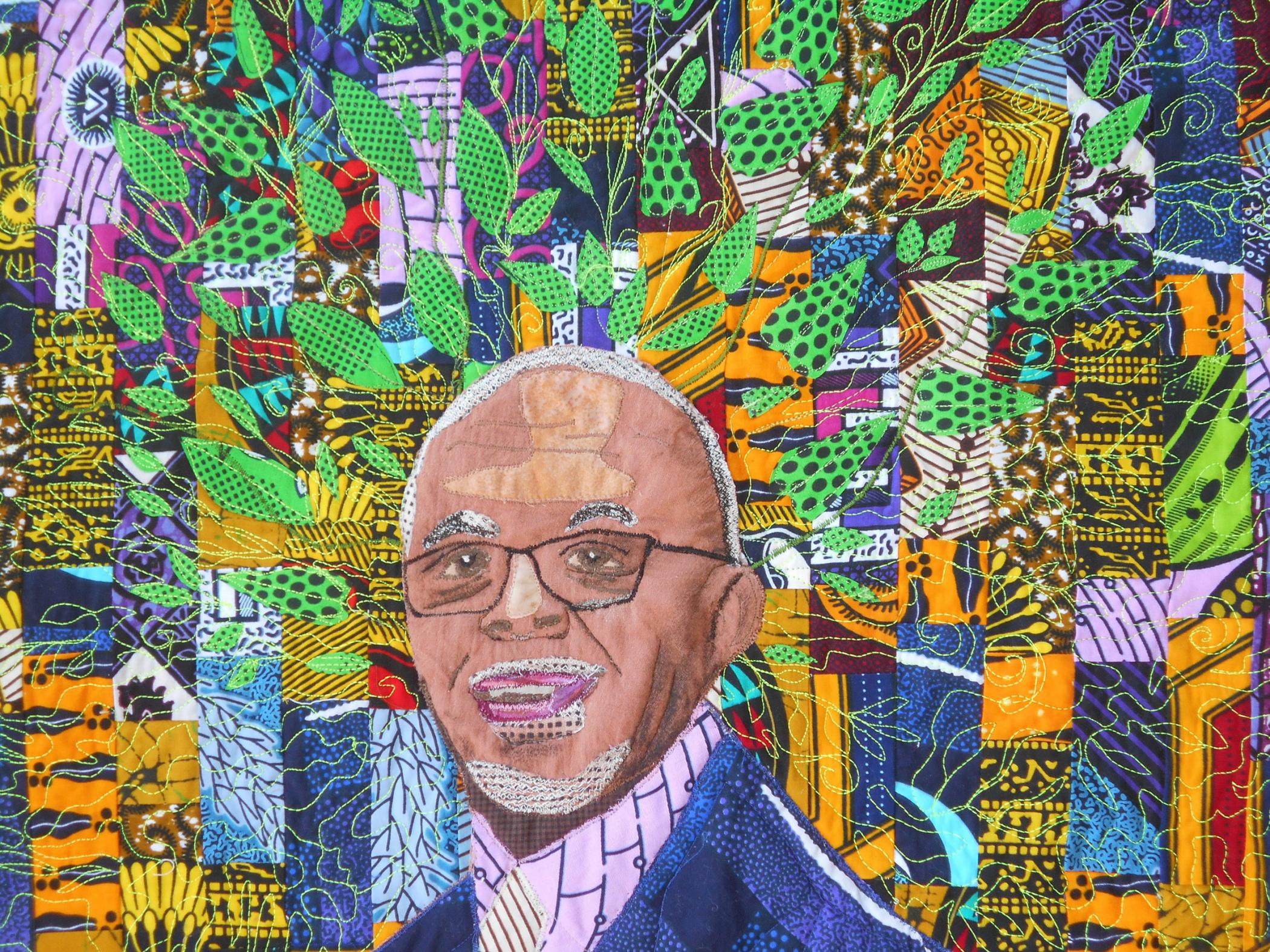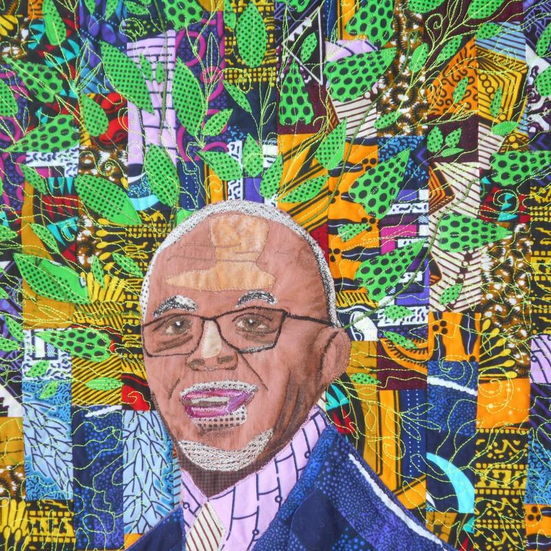 My quilt is a tribute to Henry Louis Gates, Jr., an American historian and a man who has shown the way for millions to discovering more about their ancestry. He has many accomplishments, but in this art quilt I want to celebrate how he has helped so many through his program Finding Your Roots and his other shows and books. Of particular interest to us is how he has opened the doors for African-Americans to find out more about their family histories through little known historic pathways and through the miracle of DNA testing. I have pictured Mr. Gates with the green leaves of a “family tree” behind him, symbolic of some of his most important and most enjoyed life’s work so far.
