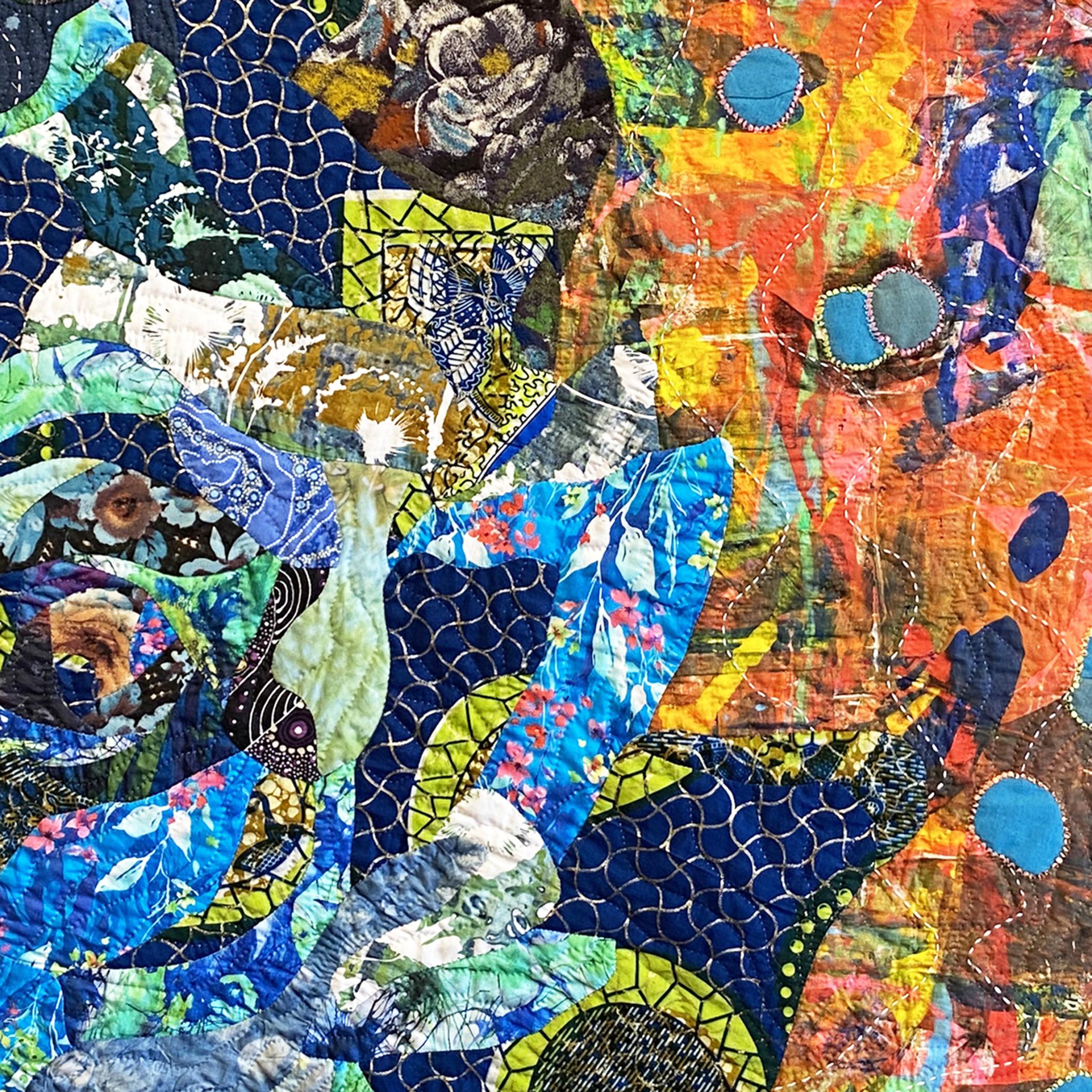Recycled clothing, printmaking wiping fabrics, satin, recycled cotton prints, artist dyed fabrics, embroidery floss, beads