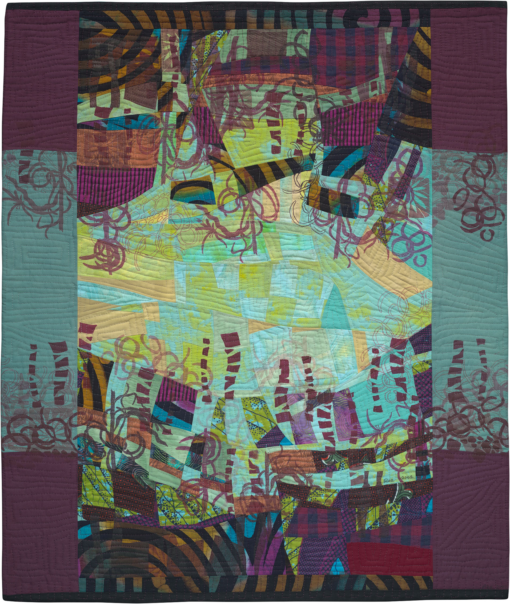 This piece was created a number years after taking a class from Nancy Crow. I was experimenting with my own way of piecing fabric, learning to hand-dye fabrics, and introducing silk-screened images into my work.