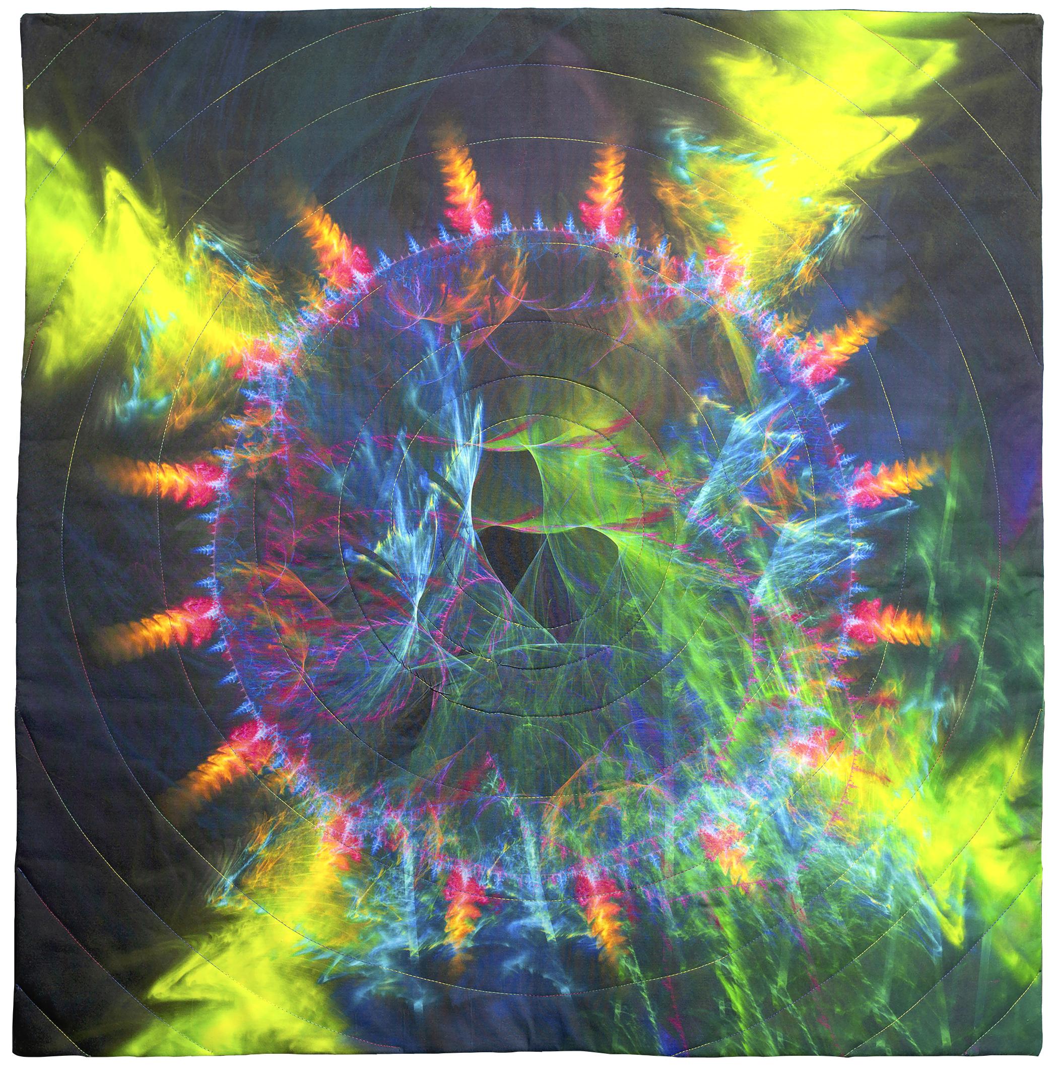 First Spark is a generative image derived from a computer-based fractal formula. Fractals are the perfect integration of art, nature, and science. Fractured geometry is used to measure irregular natural phenomena; the images generated from the formulas are extremely beautiful, and fractals are a form of higher math.