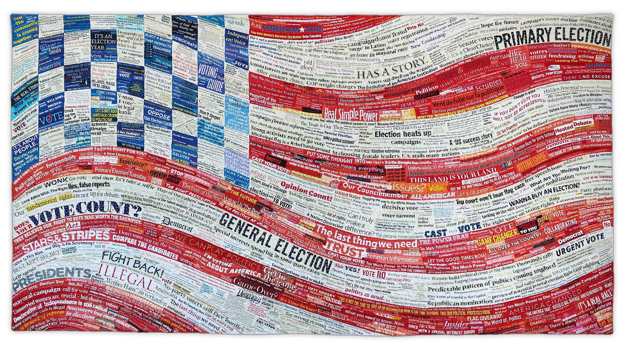 Collaged newspaper/magazine clippings digitally printed on fabric. Hand quilted.