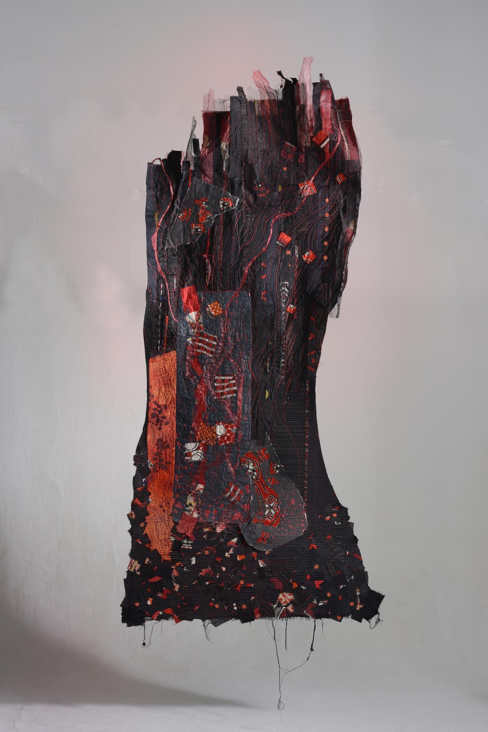 This work is mainly made with materials that evoke images of Japan, such as meisen, satin and washi paper. I didn't choose them with a Japanese feel in mind, but perhaps it's because I'm Japanese that I feel comfortable with them. This work started by weaving the red of meisen into a black-based washi paper. The contrast between the vivid red of the meisen and the shiny black of the satin, and the movement added by the stitching and linen fibers, express a burning flame.