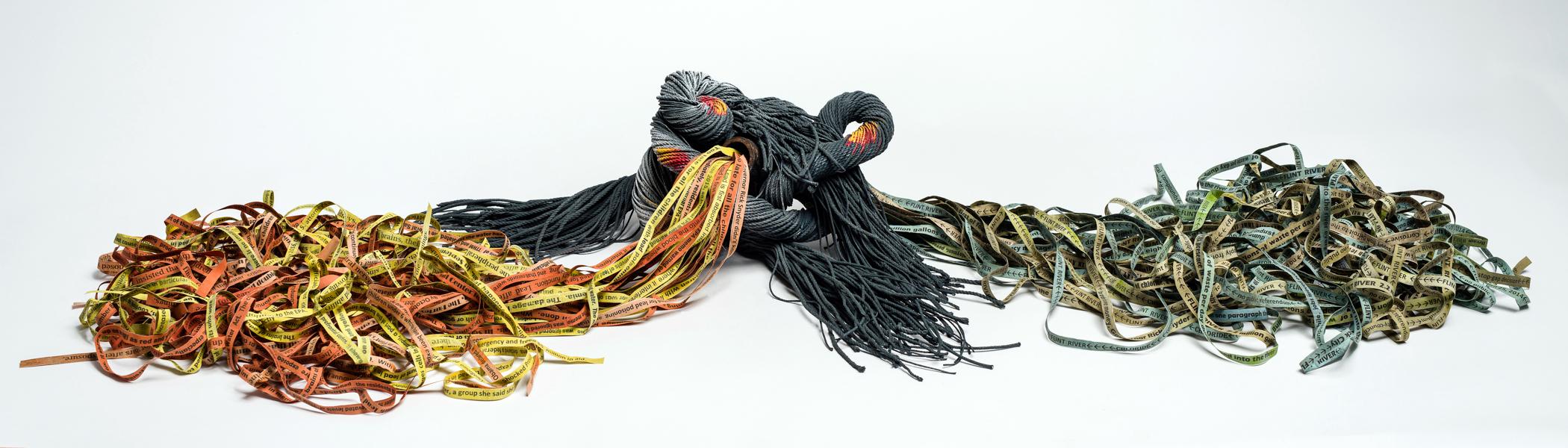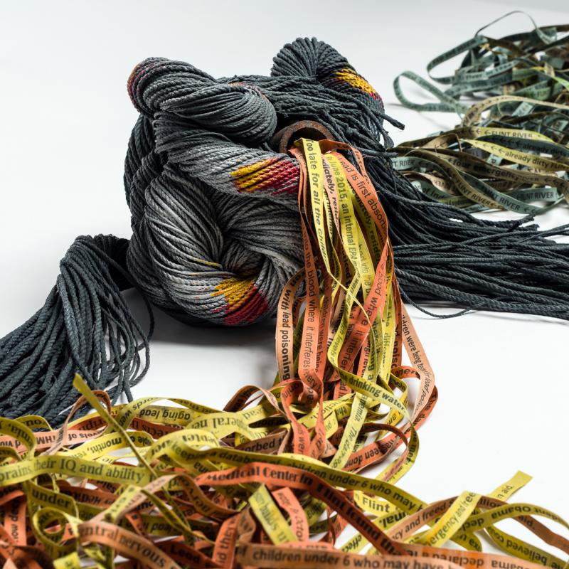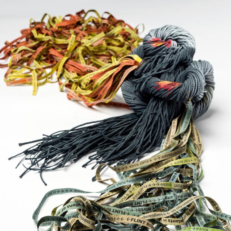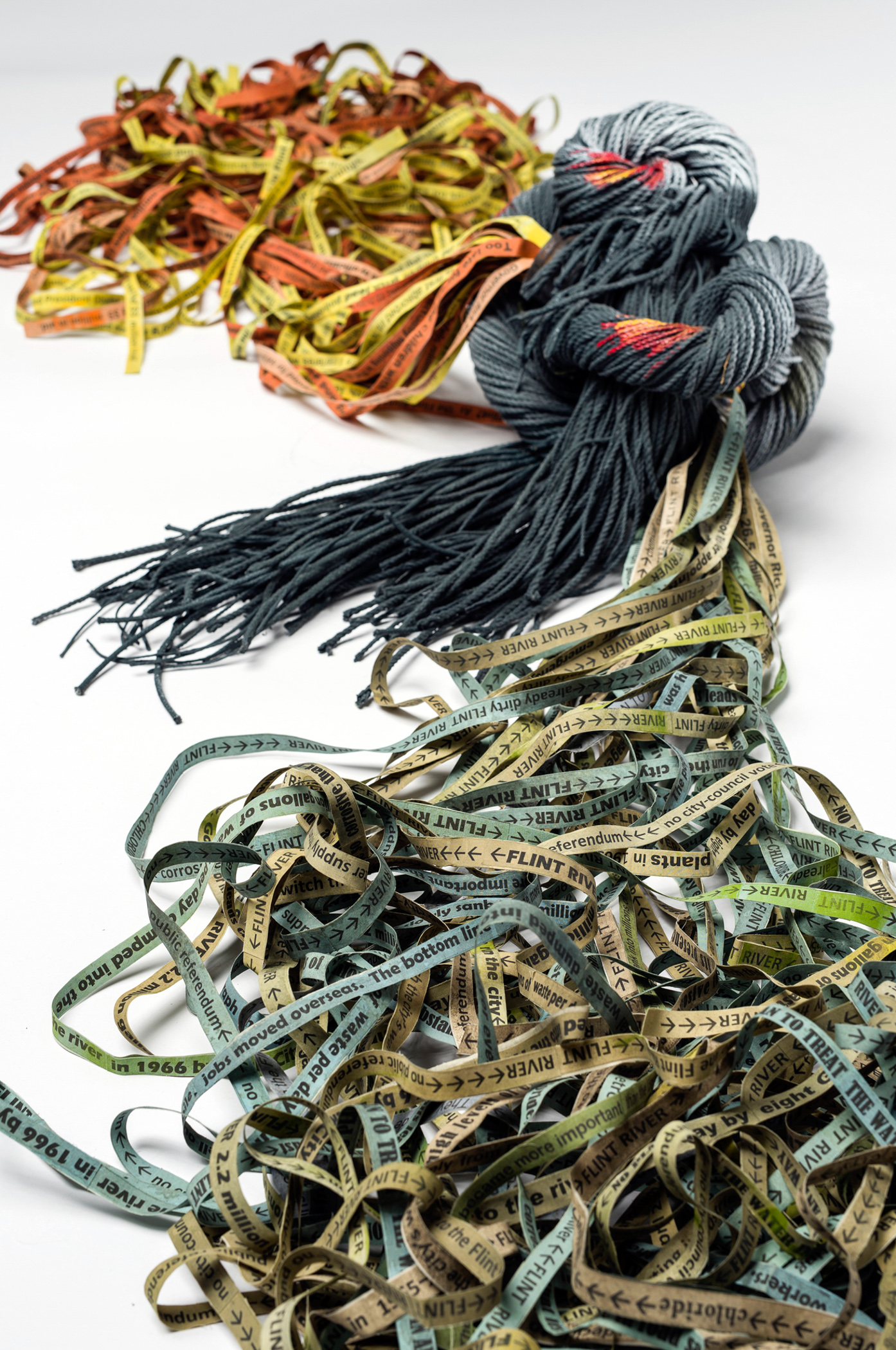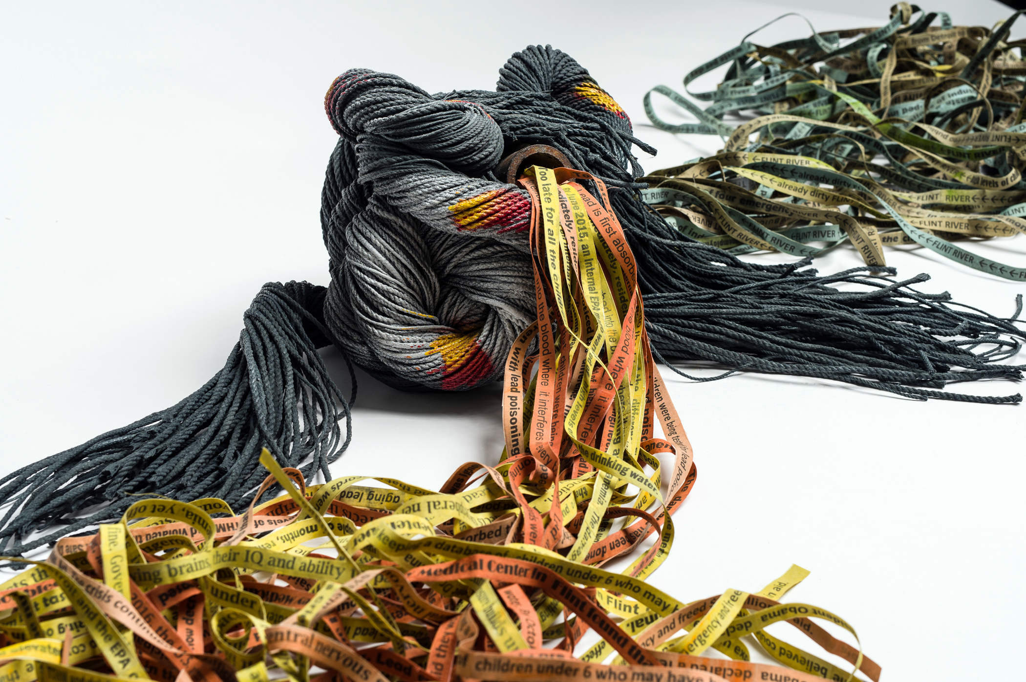 The central portion of my project is painted lead and has a pipe going through it. The rope is FLINT; it is LEAD; it is also a BRAIN. The red and yellow painted on the rope is the color that shows up in an MRI of a lead-damaged brain. The story of Flint is printed on the fabric.