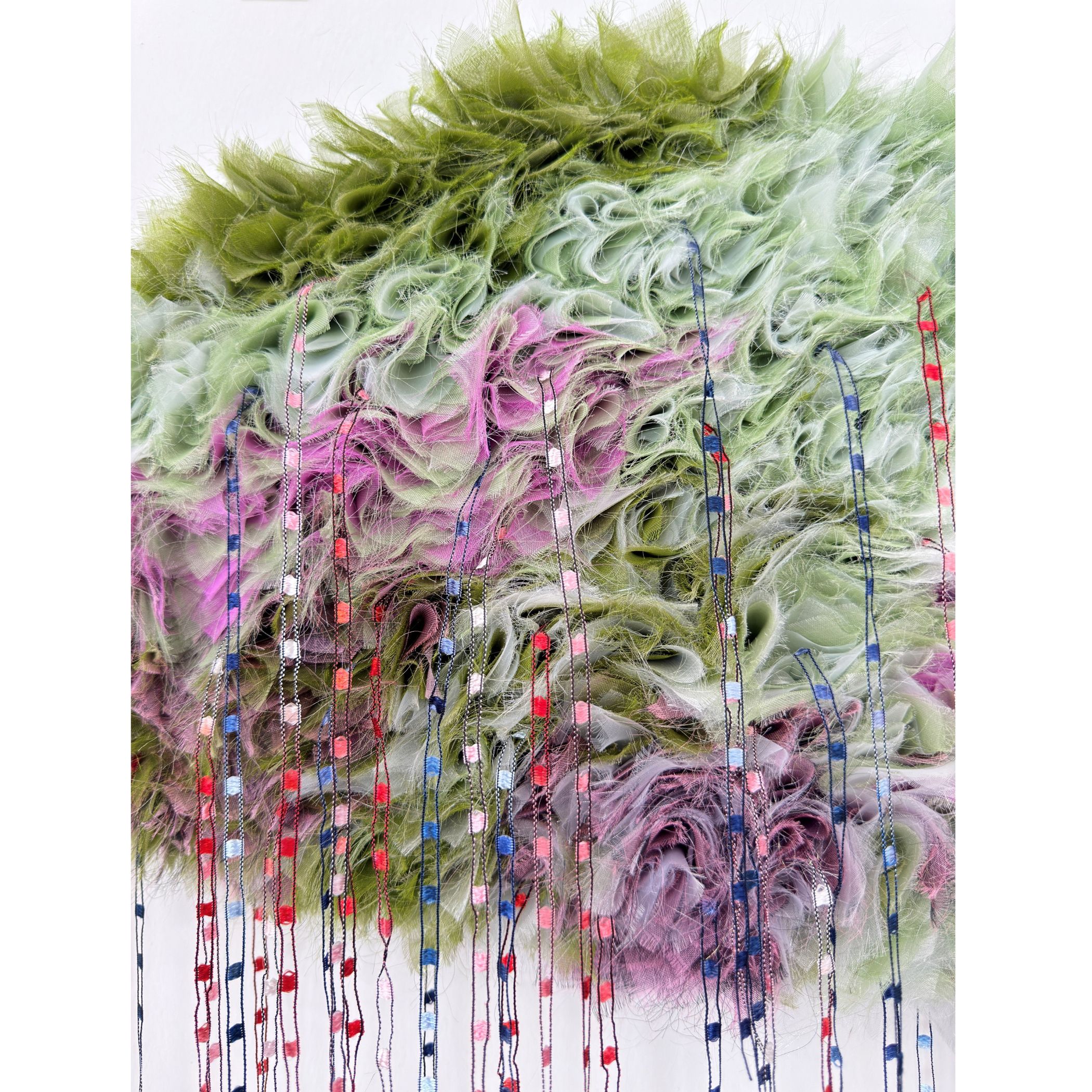 Synthetic organza fabrics, polyester decorative strings, cotton batting, and cotton backing