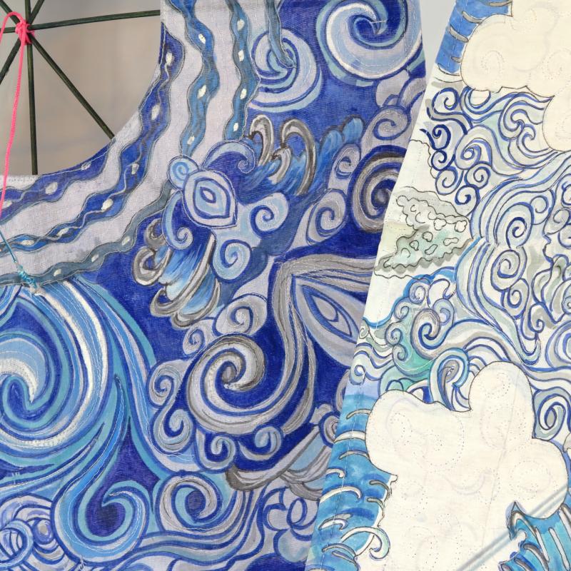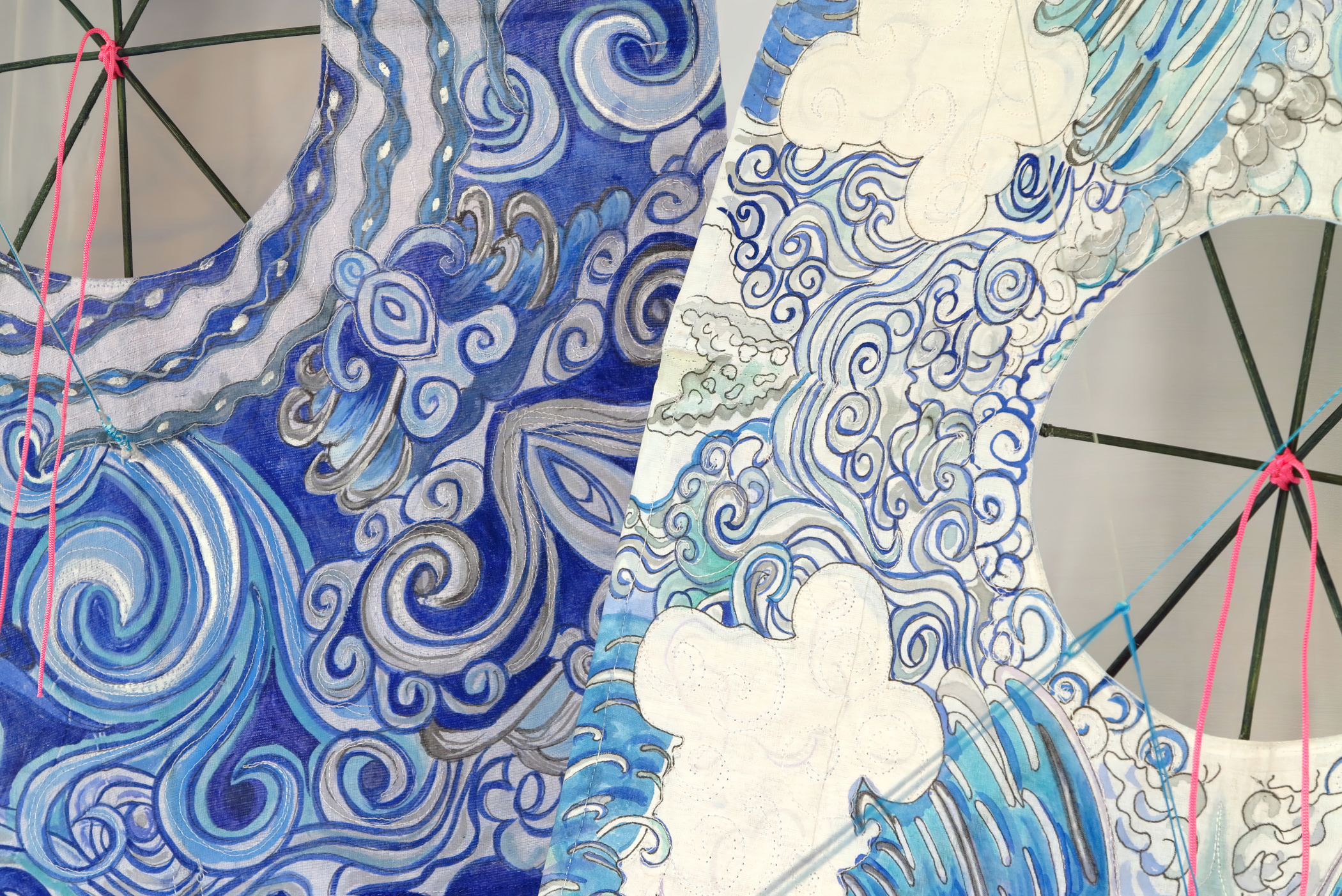 Cotton organdie, permanent ink, fusible web, bamboo, glue, nylon cord, rayon cord, plastic rings