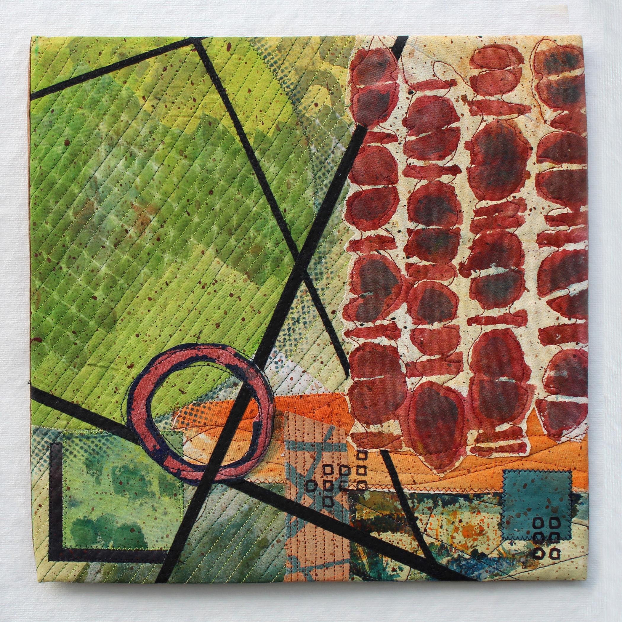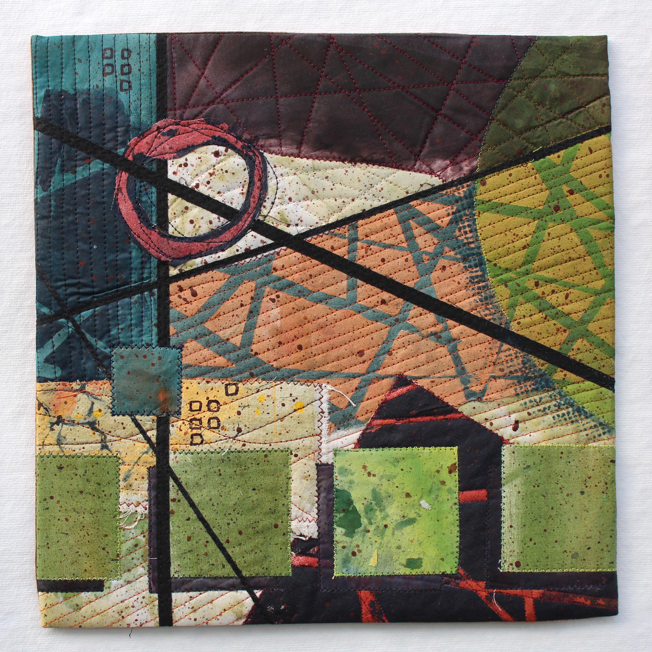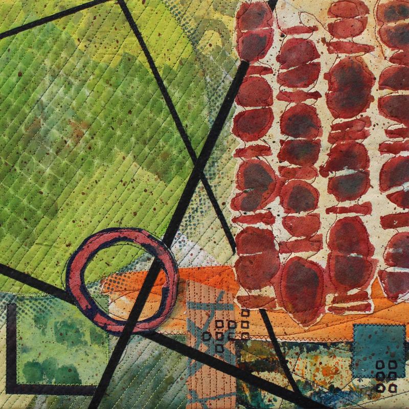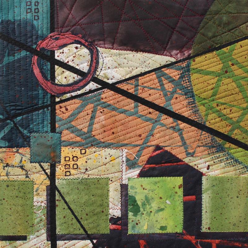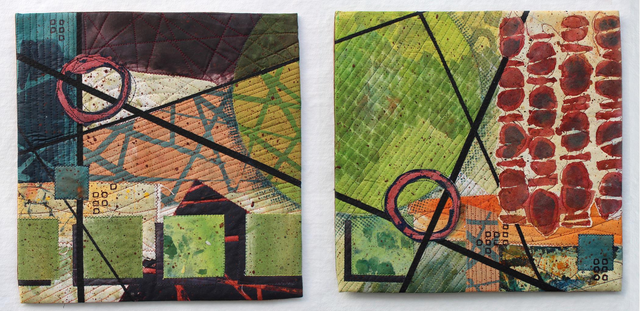 Painting and hand-printing with acrylics on fabric, collage construction, machine stitching