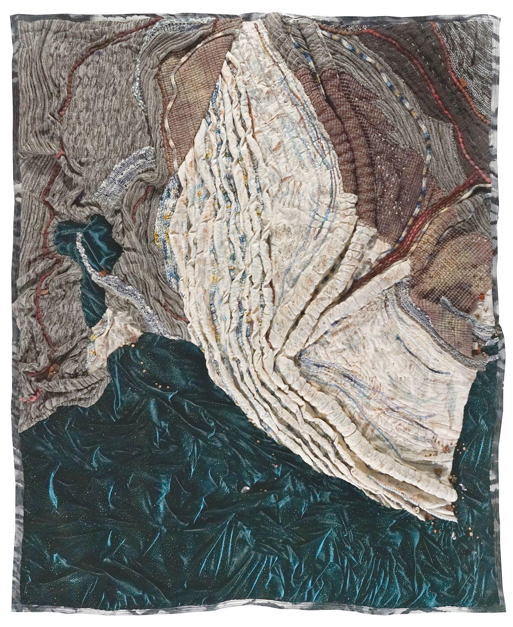 Crocheted, knitted, corded, pleated, oil paintsticks, couched, hand embroidered, machine quilted, beaded, manipulated