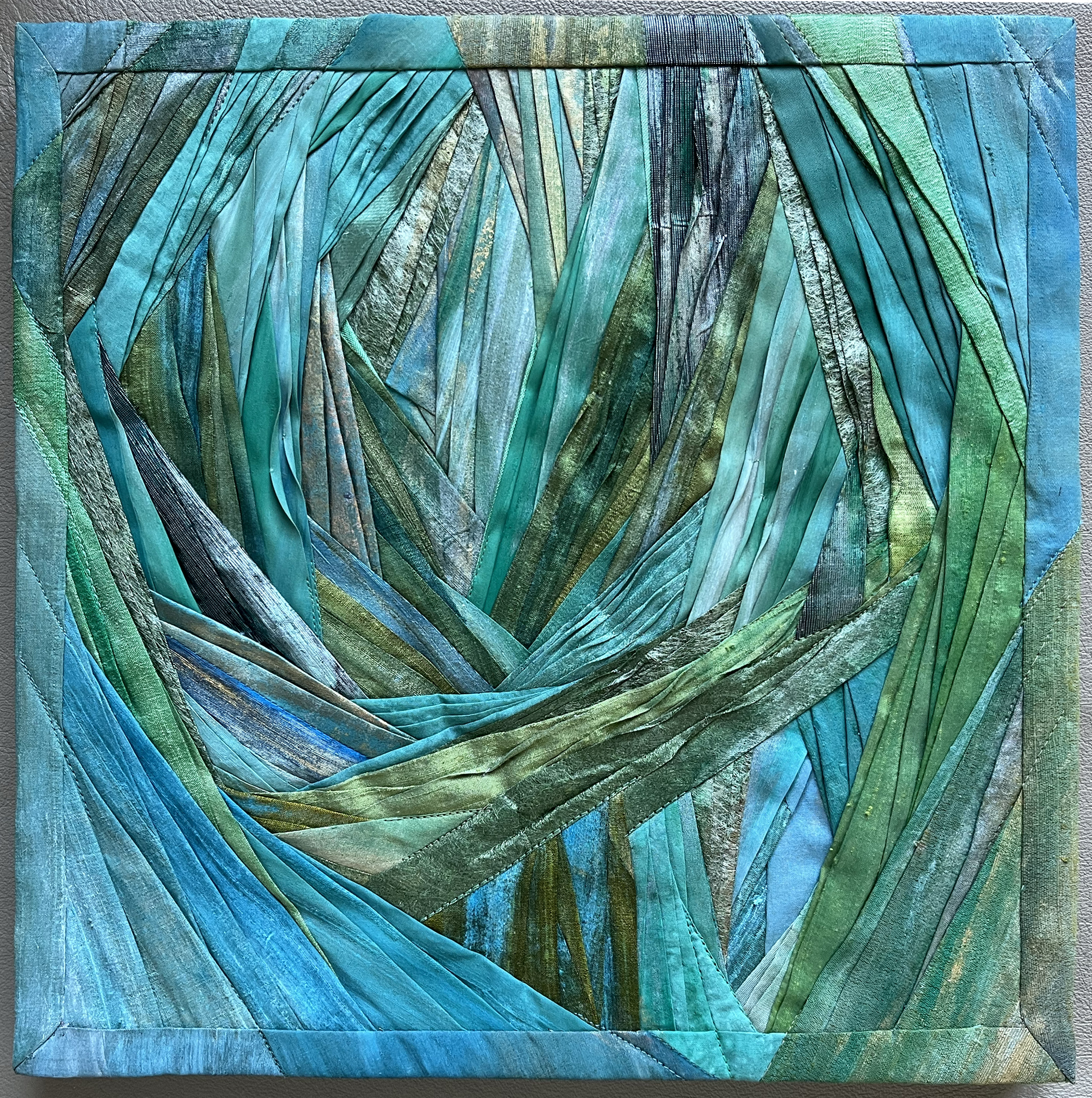 Hand painting, pleating, "no glue" folds, machine piecing, machine quilting, prairie points