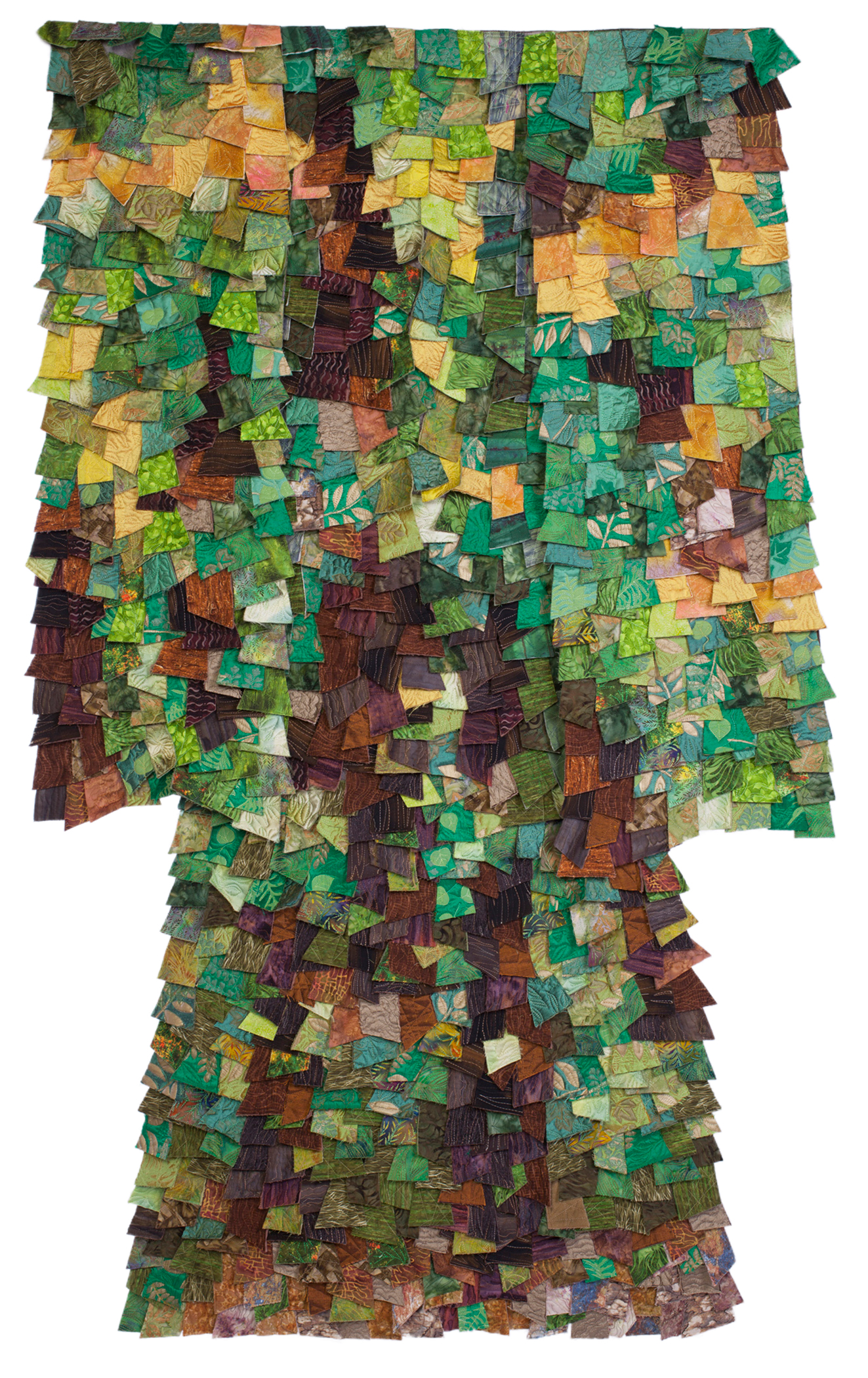 Silk screened and hand printed fabrics; commercial fabrics, hand dyed fabrics, layered, stitched, cut, and reconstructed onto a "back" or frame.