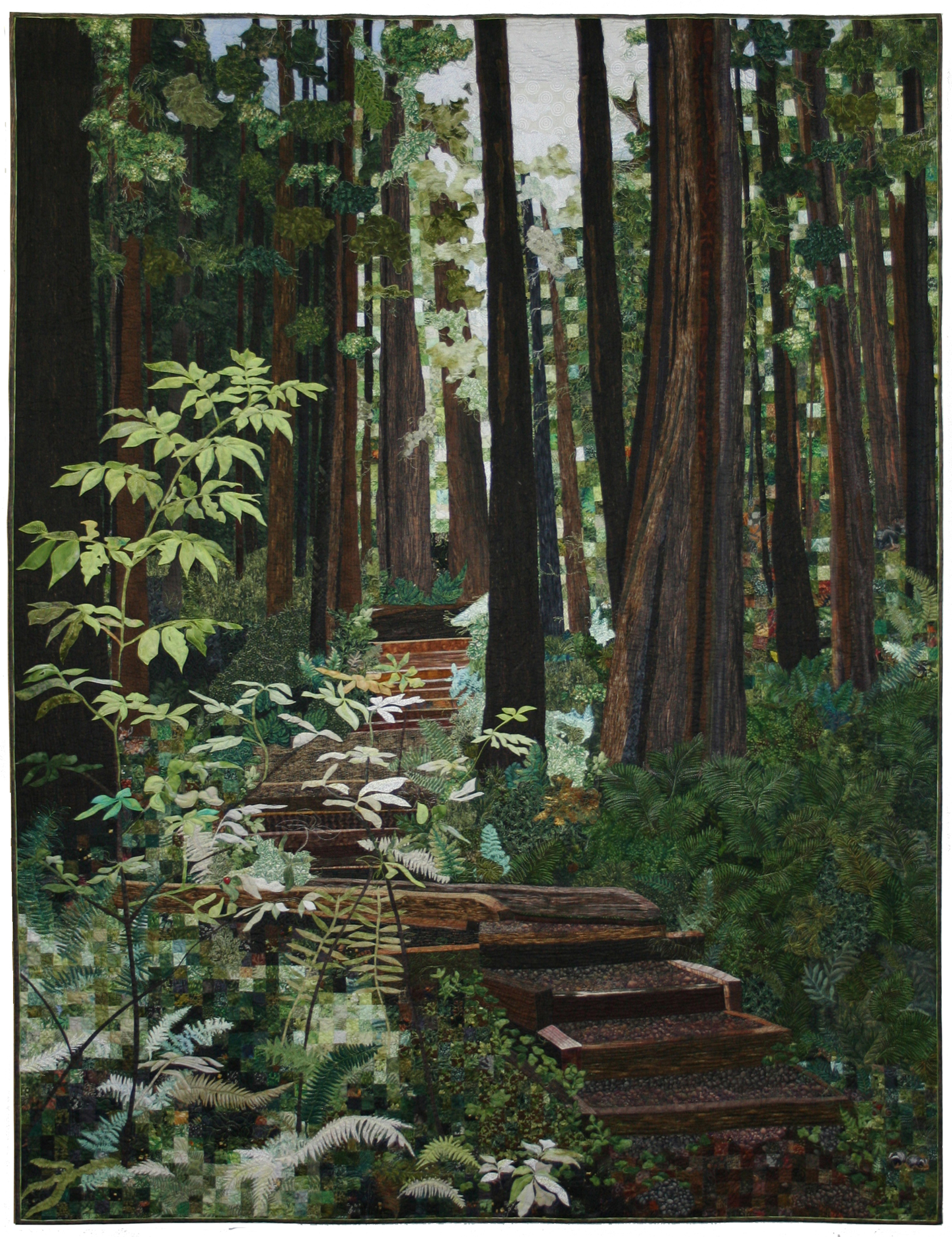 The redwood forest is a favorite place for me. This scene called to me to make it into a quilt. It was challenging to get the mood of the forest; but I enjoyed making the piece very much. The quilt was widely enjoyed as I displayed it and was purchased by the National Quilt Museum for their permanent collection.