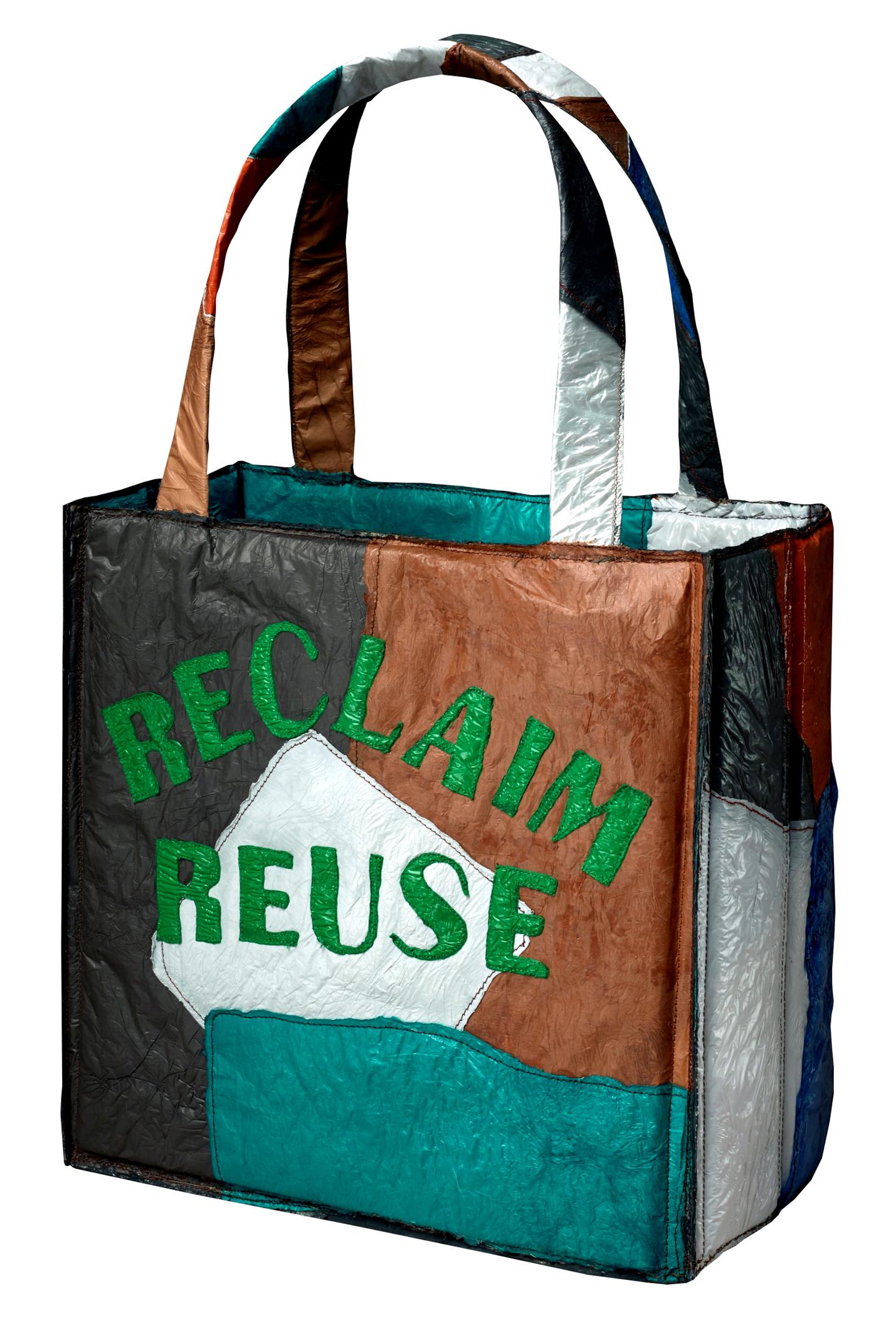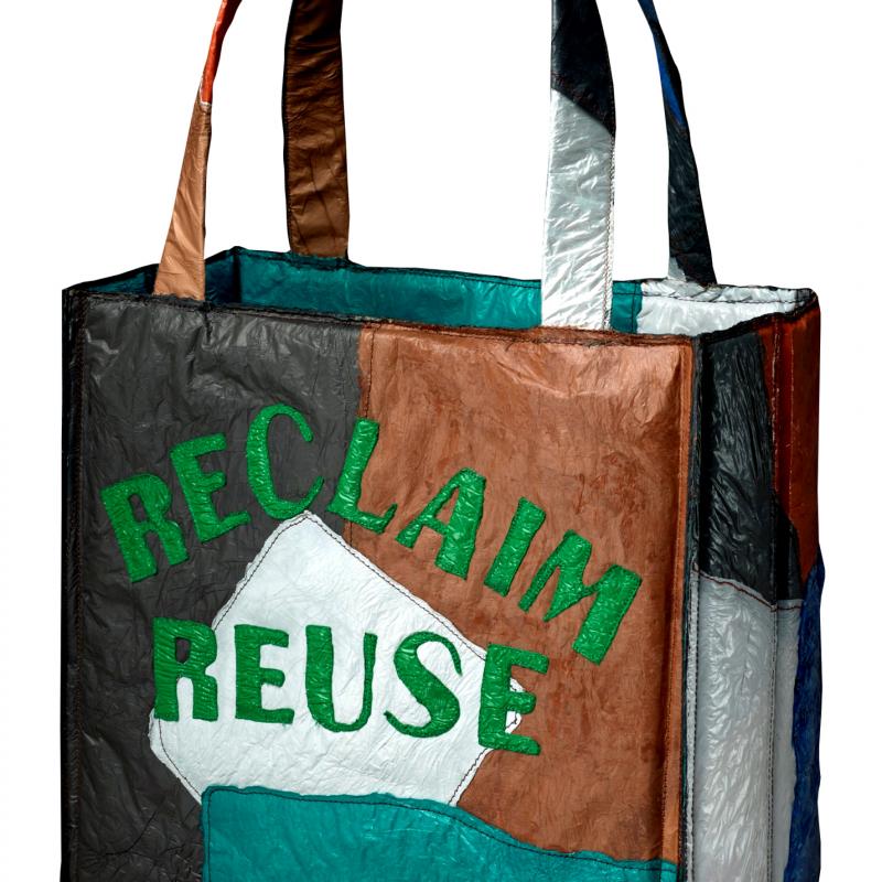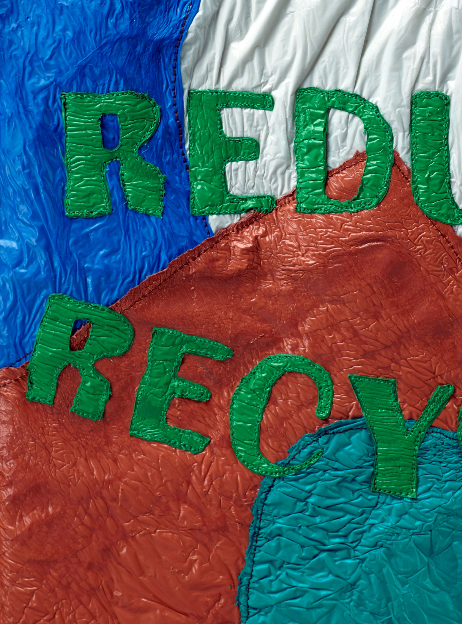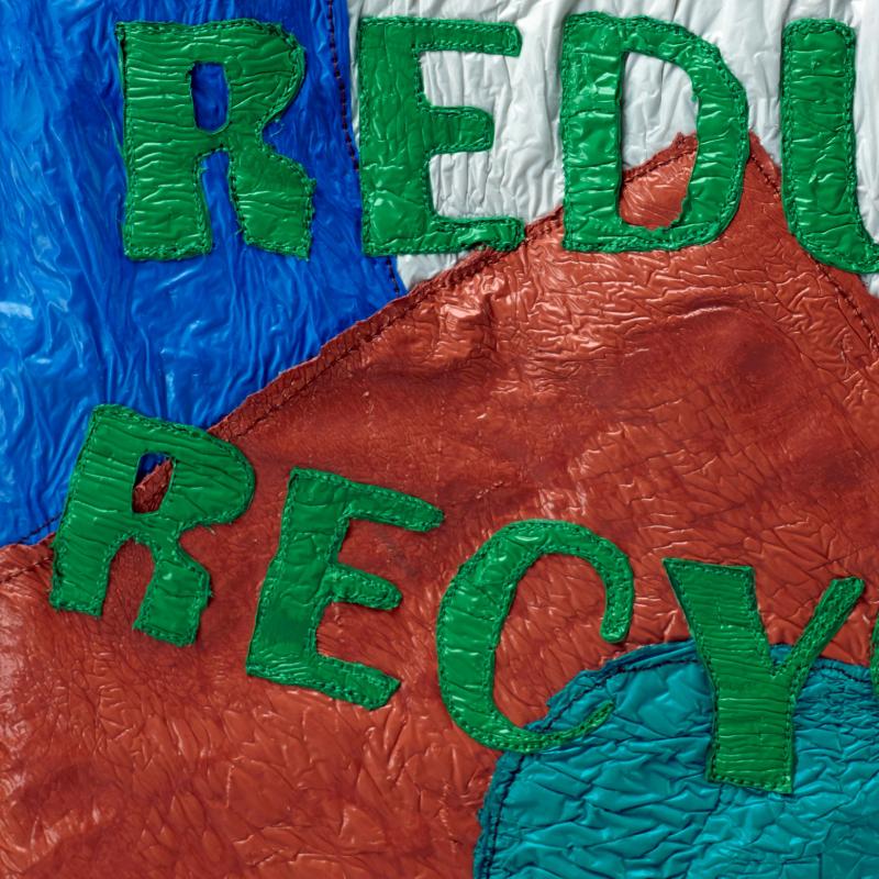 It’s hard to imagine an effective way to personally impact the vast challenges facing our planet. I’ve started by controlling what is in my immediate sphere of influence—my own behavior. As a textile artist, I’m acutely aware of my materials: what they are made of; how they are manufactured; what demands they make on our water, air quality, and use of energy; and their ultimate disposal problems. I decided to start with the four R’s: Reclaim, Reuse, Reduce, Recycle. I’ve altered many source materials in my studio and researched reduced water and lower energy intensive processes in creating my work. In constructing Four R’s, I layered, laminated, and pieced grocery and retail plastic bags together. Within this personal crazy quilt of affirmative steps, I can impact a path toward greater sustainability.