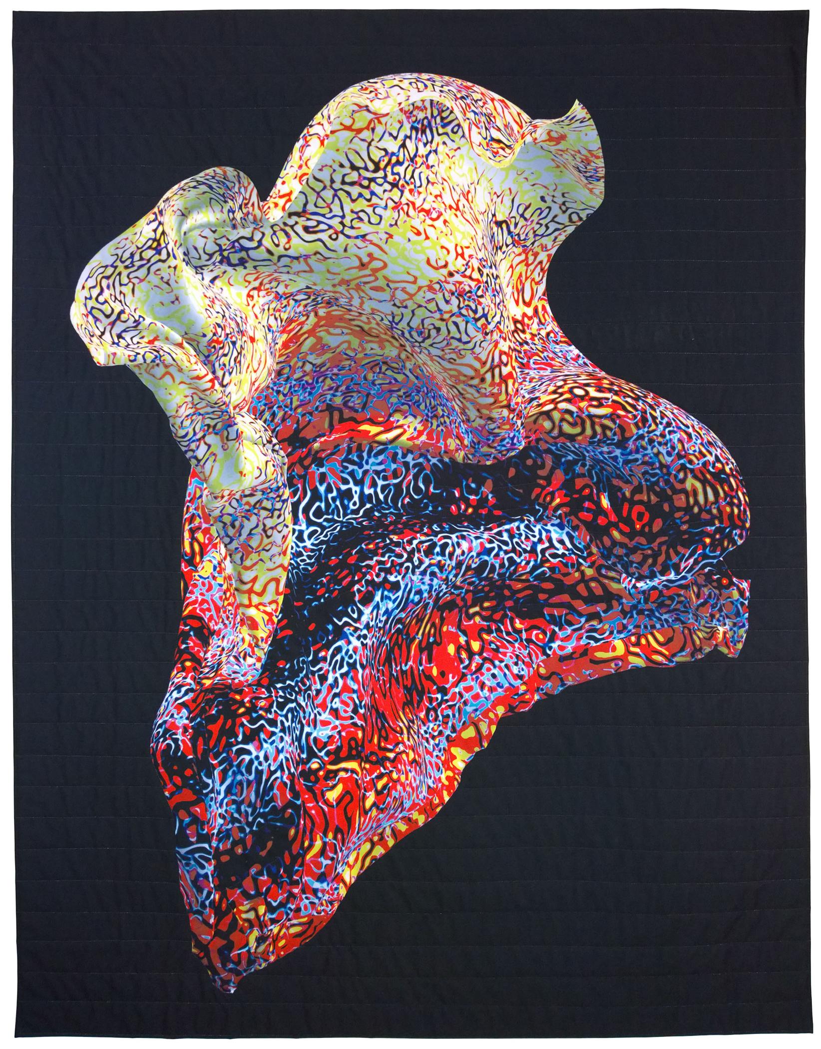 Digitally printed polyester top, batting cotton back, clear monofilament thread.